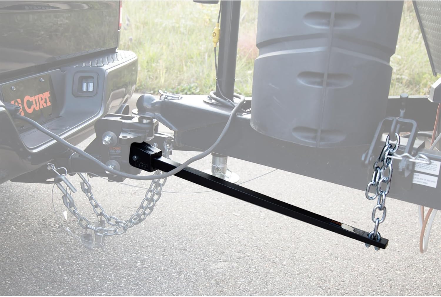 The CURT weight distribution hitch is a specialized towing system that provides improved vehicle and trailer control by leveling the trailer and more evenly distributing its tongue weight across the trailer's and vehicle's axles. Weight distribution hitches are commonly used on travel trailers and campers but can also be applied to other large loads. This replacement spring bar is designed to fit CURT trunnion bar weight distribution hitches #17322 and #17332. It features forged steel construction and a durable powder coat finish for long-lasting use. It offers a gross trailer weight capacity of 8,000 - 10,000 lbs., a tongue weight capacity of 800 - 1,000 lbs. and comes with a pre-attached spring bar chain for convenient installation and tension adjustment.