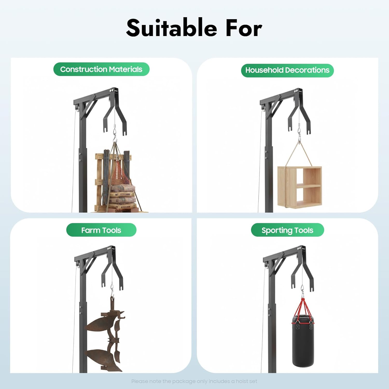 SpecificationsMaterial: SteelStyle: ModernMounting Type: HangingAssembly Required: YesVehicle Service Type: TruckFinish: SprayingColor: Black and SilverNumber of Pieces: 1Rotation: 360°Adjustable Height: 188-260cm/74-102 inchMax. Lifting Capacity: 272kg/600lbsHook Width: 61cm/24inOverall Product Size(L*H): 99*260cm/39*102inTop Length: 40.6cm/16inPackage Size: 114*54*15.5cm/44.88*21.26*6.1inGross Weight: 20kg/44.09lbsPackage Included1* Deer Hoist1* Roller1* Hook1* Extension Rod1* Hanging RodOther Accessories for AssemblyNotes1.Please note that this product cannot be used to lift people.2.Please note that our package only includes a hoist without other items.3.Please allow the slight color difference caused by the shooting light and 1-3cm error due to manual measurement, and make sure you do not mind before you order.