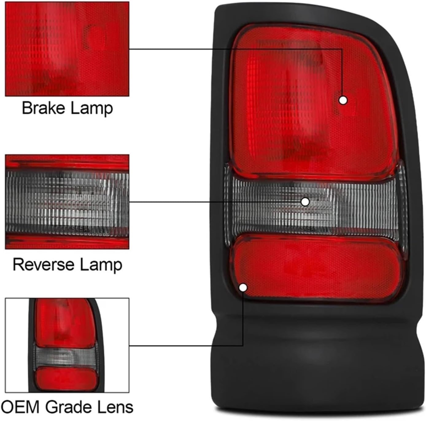 Enhance safety: the taillight assembly design is optimized, which greatly improves the brightness and visibility of night lighting and significantly enhances the driving safety at nightImprove the appearance of vehicles: not only improve the safety at night, but also significantly enhance the appearance of vehicles, with great recognition and visual impact, showing fashion aestheticsDurability and reliability: quality materials are used to resist bad weather and daily wear, reduce maintenance costs, extend service life and ensure durability and reliabilitySimple installation: easy to install and replace, reducing installation time and cost, and convenient for daily maintenanceTail Light Cover Compatible With Dodge For Ram 1500 1994-2001 Ram 2500 3500 1994-2002 Rear Lamp Housing Light Without Bulbs 55055264AC