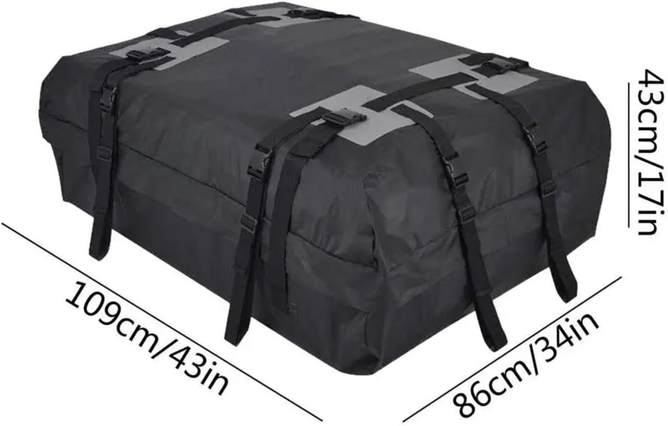 Bullet Points:1.Fixed Straps: With 8 adjustable 3.8cm buckle straps + 2 3.8cm buckle reinforcement straps together in the package, which will help you to fix Roof Rack Cargo tightly thus it doesn't fall off.2.Large Storage Space: Large capacity and flexible soft-shell design allow Rooftop Cargo Carrier to store more items and some oddly shaped items, making your car more tidy3. Material: Composed of high-class 600D Oxford cloth material, Car Roof Bag has the characteristics of high strength, durability, and weatherproof capability. 4.Can be Folded: Cargo Bag is in a foldable design, compact and easy to fold, you can fold it and packed into a storage bag , which is so space-friendly. 5.Wide Applicable: Cargo Bag Rooftop is suitable for any car, or truck. Whether your vehicle is rack-mounted or not, it can be installed quickly and easily in minutes Descriptions:15 cubic feet capacity Cargo Bag adopts 600d oxford cloth material, which is weatherproof and durables for travel, cars, truck, etc.Features:- Made of 600D Oxford cloth, durables and weatherproof- Soft-shell will be flexible to store even oddly shaped items- 15 cubic feet large capacity, which can accommodate a lot of items- Use high-frequency welding seams, concealed zippers, and double hook zipper flaps- Comes with 8 3.8cm buckle straps and 2 3.8cm buckle reinforcement straps for extra security- The car roof bag is compact and in a folding design, which is so space friendly.Specifications:Item Type: Cargo Bag RooftopMaterial: 600D Oxford clothSize: L*W*H: Approx. 109*86*43cm/43 x 34 x 17inchLoading Capacity: 15 cubic feetAnti-skid Pad Size: Approx. 90*120cm/35.43*47.24inchZipper: #10 normal zipper + 2 slidersDetails: Top 8 3.8cm buckle straps + 2 3.8cm buckle reinforcement strapsPaste Interface: 10cm lengthened reinforcementColour: BlackPackage List:1*Roof Rack Cargo OR1*