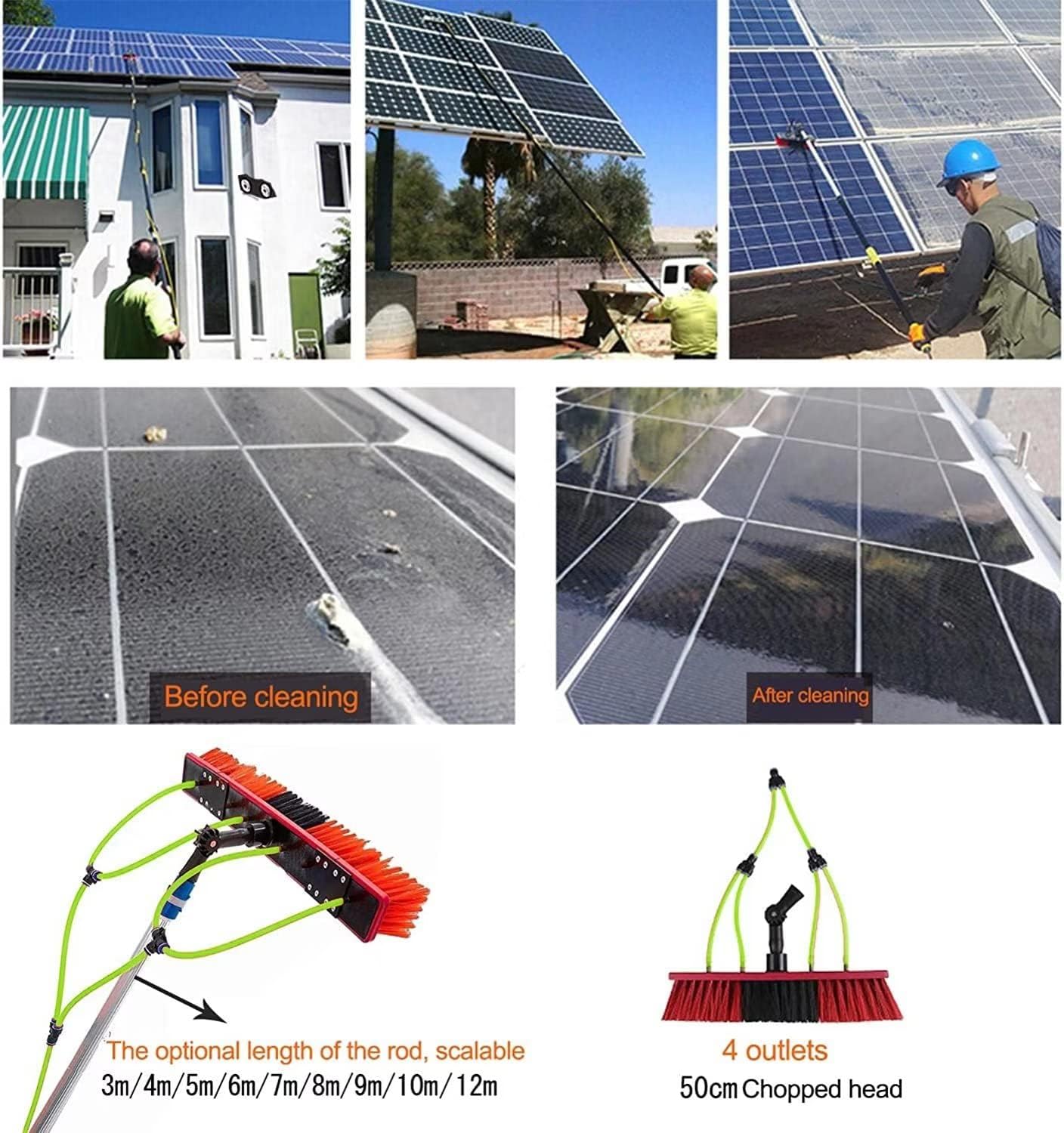 Are you still awkwardly trying to climb the ladder to clear the high windows ! With this window cleaning brush, you can reach the window from the ground faster and safer than ever. This is a fully scalable water column cleaning system that can be connected to a pure water system or garden hose. Window Cleaning Equipment Features: Multifunctional water spray brush, high altitude cleaning. Using high-density reinforced aluminum alloy, high hardness, not easy to rust, and light weight. It will not bend even if it is 10 meters long. The steel buckle is fixed for easy installation and disassembly. Pure copper switch, anti-corrosion and more durable. Universal design, the brush head can rotate freely. Sponge non-slip handle Product parameters: Material: aluminum+carbon fiber Water supply hose: 20M Scope of use: window cleaning, photovoltaic panel cleaning, bus / exterior cleaning, large vehicles, trucks, trucks, caravans, boats, etc. Packing list: Telescopic rod x1 brush head x1 angle adjustment joint x1 three-way split joint x1 quick joint x1 locking mechanism adjustment tool x1 water supply hose x1 Service: