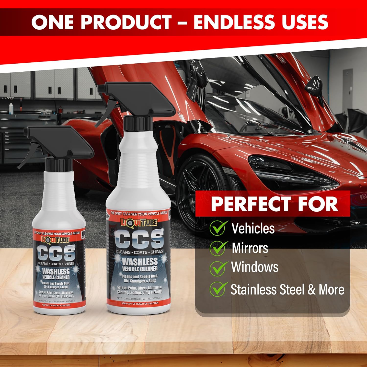 LiQuiTube CCS (Cleans Coats and Shines) is a revolutionary all surface, rinse free, vehicle cleaning solution and bug remover designed to clean, coat, and shine all vehicle surfaces with ease. Utilizing advanced polymer chain technology, CCS provides a streak-free finish with no visible residue on a variety of materials, including paint, plastic, aluminum, leather, acrylic, chrome, fiberglass, and windshields. In addition to vehicles, CCS is perfect for household surfaces such as countertops, mirrors, windows, stainless steel appliances, and backsplashes. As a non-flammable formula, CCS is also safe for engines, stoves, microwaves, and BBQ grills. Application is simple—just spray CCS directly onto the surface or onto a microfiber towel, then wipe and buff for a smooth, clean shine. With no visible residue, CCS also leaves your matte surfaces with a clean matte finish. For optimal results, use clean microfiber towels to prevent streaks or smears. If the surface is heavily soiled with mud or dirt, rinse it off and let it dry before applying CCS. Designed for both interior and exterior surfaces, CCS is safe for wrapped vehicles and graphics, providing protection without affecting adhesion. It also helps with light paint oxidation, though heavily oxidized paint may require specialized products before CCS application. Additionally, CCS can be removed with water and detergent before adding new decals, wraps, or graphics. Beyond cleaning, CCS provides lasting protection by repelling dust, smudges, water spots, fogging, bugs, and bug residue. The protective coating lets dirt dust and bugs slide off with ease. A single 32-ounce bottle is cost effective and highly efficient, allowing multiple full-vehicle applications with just 2-4 ounces per vehicle, depending on size. For best results, always test CCS on a small, inconspicuous area before full application. Use as often as needed to keep your vehicle and household surfaces looking their best!