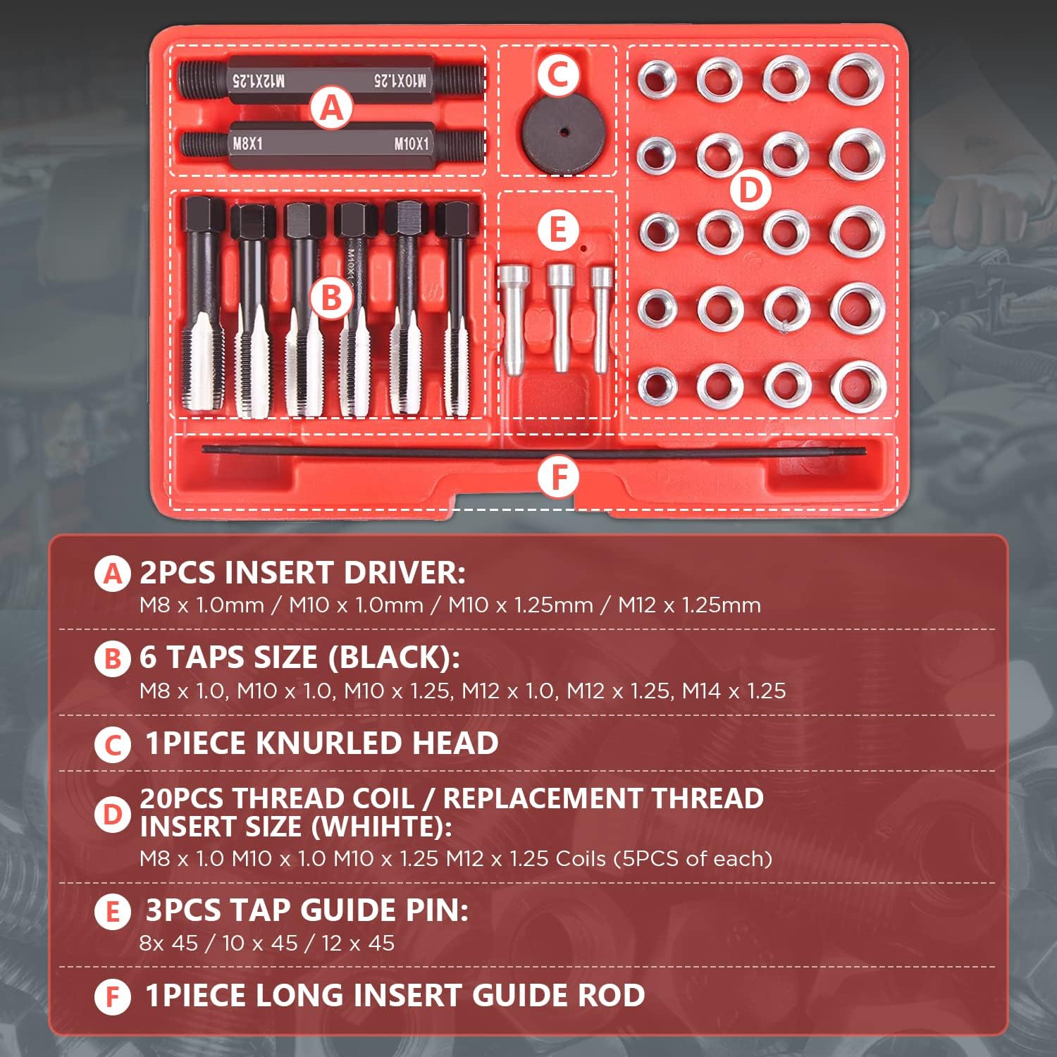 • 【Premium Quality】This rethreading kit contains 6 metric rethread taps sizes: M8*1.0, M10*1.0, M10*1.25, M12*1.0, M12*1.25, M14*1.25, 20pcs thread coils size: M8*1.0 M10*1.0 M10*1.25 M12*1.25 coils (5pcs of each), 2pcs insert driver: M8 x 1.0mm / M10 x 1.0mm / M10 x 1.25mm / M12 x 1.25mm, 3pcs tap guide pin: 8x 45 / 10 x 45 / 12 x 45, 1piece long insert guide rod and 1piece knurled head