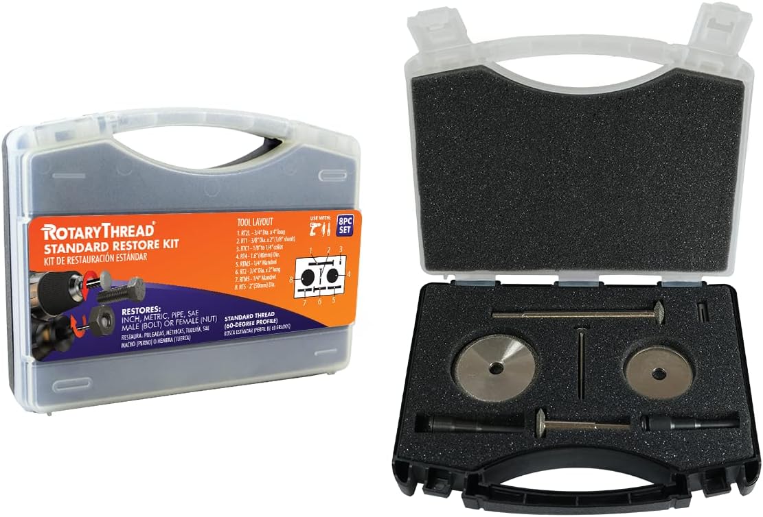 The RTK3.1 is a 8 piece standard thread restore kit for restoring threads that includes the most popular models: RT1, RT2, RT2L, RT4, RT5, RTC1, RTM5 (2). Everything a professional or serious home owner needs to do any thread restoration quickly and easily. Reaches virtually any spot you will need to restore your threads. The best option to carry with you on troubleshooting jobs, maintenance calls, or a great kit to have in the shop at home. Rotary Thread Files restore damaged threads, removes corrosion and paint quickly and easily. One tool will restore inside and outside threads for coarse and fine inch, metric, and pipe threads. It restores metal, hardened metal, ceramic, and plastic. It works by restoring one pitch crest/root at a time. Chuck it up in your favorite hand drill, die grinder, or small rotary drill, and let the tool do the work for you. Use light tool pressure and work the tool into the area to be restored. Most restorations take only a few seconds to complete. For best performance and life, we recommend using a light cutting/tapping oil or the like. Applying Non-flammable paint thinner helps clean the tool during and after restore. It's fast, efficient, simple, convenient. Great for home projects, yet built for professional use. Patented in USA US 10,183,372,B2 Global Patents Pending Family Operated USA Company