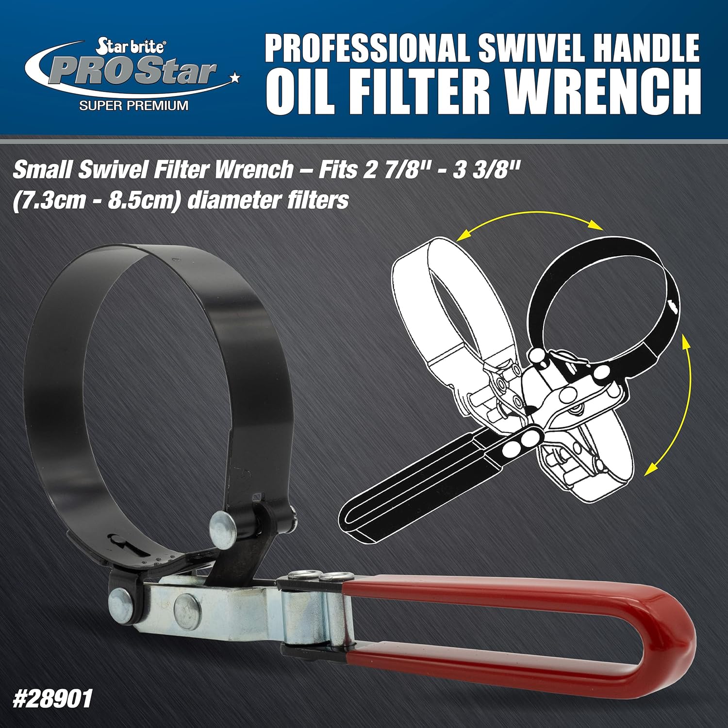 The Star brite Professional Small Swivel Handle Oil Filter Wrench is engineered for precision and ease of use in tight spaces. Designed to fit oil filters from 2-7/8" to 3-3/8" in diameter, this wrench features a 180° swivel handle for navigating around obstructions. Built from high-quality steel, it delivers a secure grip with its wide, textured band and unique yoke design, preventing crushed filters while ensuring quick, damage-free removal. The non-slip, comfortable grip makes it an essential tool for marine, automotive, and small engine maintenance.