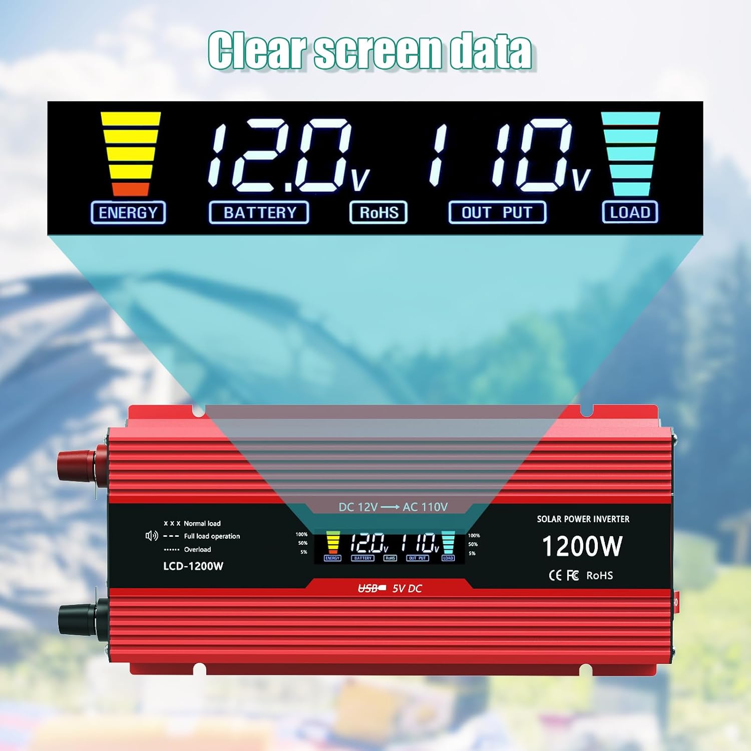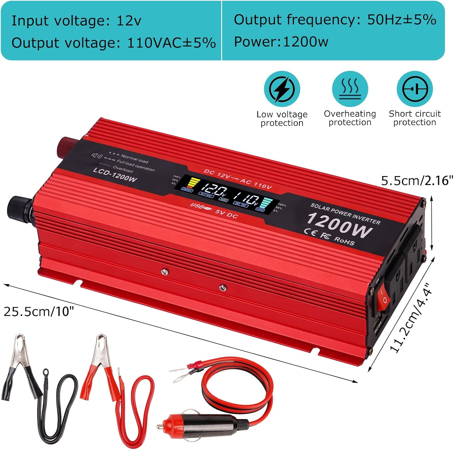 Specification: Output Wave: Modified sine wave Output Continuous Power: 1200 Watt DC Input: 11V-15V AC Output: 110V USB Output: 5V DC Package Included: 1 x Inverter 2 x Crocodile clips Note: 1. The total power of the connected equipment cannot exceed the maximum output power of the inverter. 2.This is a Modified Sine Wave series inverter, not applicable for air conditioners, refrigerators and microwave ovens. 3. If the output power of the inverter is HIGHER than 150W, we strongly recommend you using the Crocodile Clips to a battery (clips are included) but not the cigarette lighter, because your car cigarette lighter might not afford power over 150W.