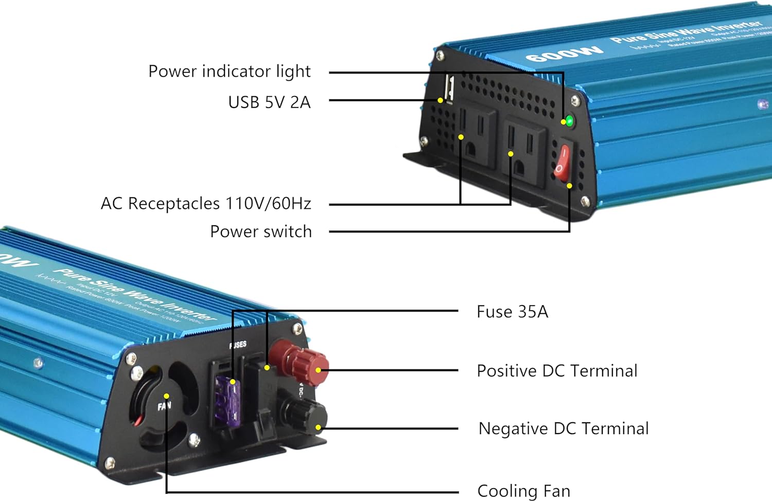 CautionsThis is not a toy, keep out of reach from childrenNever connect the inverter to AC distribution wiringDo Not× Install near flammable materials× Use or make connections in mark or designed as IGNITON PROTECTED× Expose to rain, snow, water, or any other liquids× Use with positive ground electrical systems× Plug foreign objects into the receptacles× Open,there are no user serviceable parts insideSpecificationsMax Continuous Output:600WPeak/Surge Capacity:1200WNormal Input Voltage:12VDCInput Voltage Range:10-15VDCMax Efficiency:90%Output Voltage:110-120VACOutput Frequency:60Hz-+2HzOutput Waveform:TRUE SINE WAVE Low Voltage Shutdown: 10.5+-0.5VOver Voltage Shutdown:15.5+-0.5VNo Load Current Draw:<0.3AFeatures√ Low Battery Automatic Shutdown√ Overload and Short Circuit Protection√ Reserve Polarity Protection(by fuse)√ Compact Size, Light Weight, High Efficiency√ High Surge Current Capability to Star TVs, Motors and other Inductive Loads√ Thermal Protection√ Built-in Cooling Fans√ Soft Start TechnologyPackage List1 x 600W Pure Sine Wave Power Inverter1 x User ManualA set of alligator clip cable