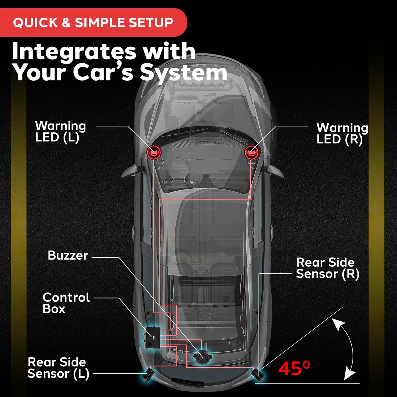 Ultrasonic Blind Spot Detection System, BSD Change Lane Safer, BSA BSM Blind Spot Monitoring Assistant Car Driving Security with Reverse Parking System, LED Buzzer Monitor, 5 Meter Range || SET OF 2 ULTRASONIC SENSORS: The blind spot detection system includes 2 ultrasonic sensors, 2 blind regions monitor (LED Light) with buzzers, wire harness, LED extension cable, and nylon cable tie || CHANGE LANE WITH SAFETY: Installing an ultrasonic blind spot detection system in your vehicle allows you to change lanes safely as it automatically notifies you via the included buzzer LED indicator if another vehicle comes near the next lane || 0-5 METER VEHICLE DETECTION LENGTH: With a 5-meter long and 2.5-meter wide detection length, the blind spot detection system is ideal for monitoring closing objects on the neighbor lane. Integrates blind spot detection & reversing assistance || MULTIPLE FUNCTION DETECTION SYSTEM: Featuring three functions, this detection system has Blind Spot Detecting System (BSD) Function, Lane Change Assist (LCA) Function, and Rear Cross Traffic Alert Function (RCTA) Function || FOR 12V ELECTRICITY VEHICLE INSTALLATION: This product is applied to 12V battery vehicles, make sure to check before installing. It also has a maximum power of 5W with working temperatures of -40°F ~ +185°F and storage temperature of -40°F ~ +185°F