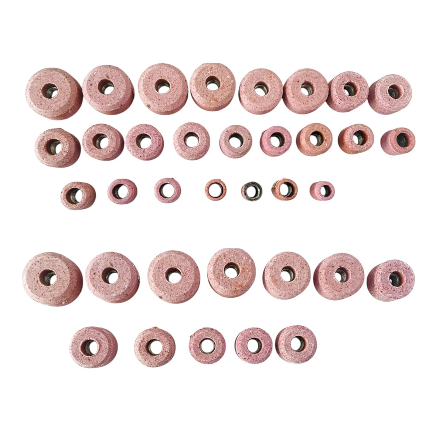 Upgrade your valve reconditioning toolkit with this 36-piece Valve Seat Grinding Stone Set designed specifically for Sioux holders with 11/16" thread size. Each stone is made from premium 80-grit medium aluminum oxide (pink bond) for long life, precise cutting, and excellent surface finish. The set includes 12 popular diameters (from 1" to 2-1/2"), with 3 pieces of each size, providing versatility for a wide range of automotive and engine repair applications. All stones can be dressed to any desired angle while keeping the thread intact — making them ideal for both standard and custom valve seat profiles. Built with heavy-duty construction, these stones are durable and reliable, ensuring consistent results for professionals and enthusiasts alike.
