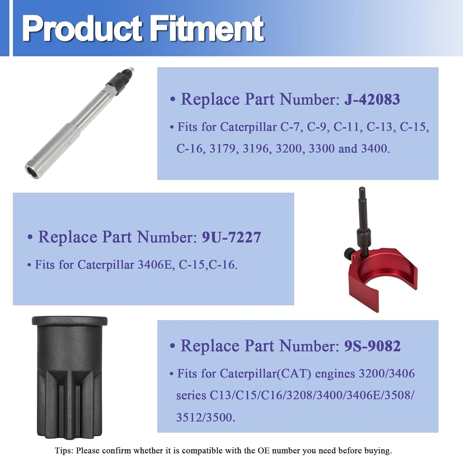 Fitment:J-42083 Timing Pin fits for Caterpillar C-7, C-9, C-11, C-13, C-15, C-16, 3179, 3196, 3200, 3300 and 3400.9U-7227 Injector Height Tool fits for Caterpillar 3406E, C-15, C-16.9S-9082 Engine Barring Socket fits for Caterpillar (CAT) engines 3200/3406 series C13/C15/C16/3208/3400/3406E/3508/3512/3500.Replace Part Number:Replaces #J-42083, 9U-7227, 9S-9082.Function:Timing Pin and Adapter: Easier to perform timing, get TDC and start valve and fuel injection timing procedures。Injector Height Tool: Accurately adjust the injector height of the engine.Engine Barring Socket--Turn over engine, makes adjusting injectors and valve lash easier.Material:High-quality steel for timing pin and engine barring socket.Aluminum alloy construction with anti wear property for injector height gauge tool.Package:1 x J-42083 Automatic Engine Timing Pin1 x 9U-7227 Injector Height Adjustment Gauge Tool1 x 9S-9082 Engine Barring Socket