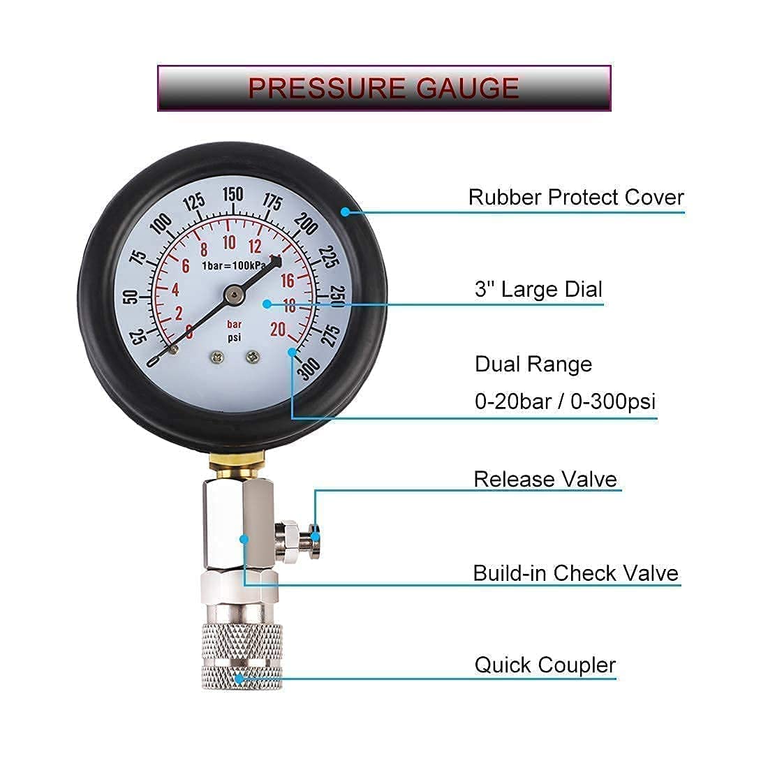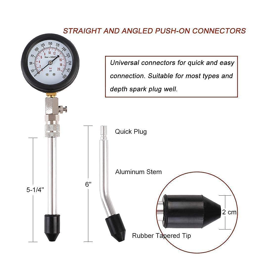 JIFETOR CYLINDER LEAK DOWN TESTER KITASSIST TO DETECT FOLLOWING ENGINE FAULTSWorn piston rings, worn valves, cracks in cylinder walls and blown head gasketsLOCATION OF LISTENING POINTS1.OIL DIPSTICK TUBE - for leakage from damaged or worn rings and/or cylinder wall2.RADIATOR FILLER - for cylinder wall cracks or head gasket leakage3.ADJACENT CYLINDER - for head gasket leakage4.TAIL PIPE - for exhaust valve leakage5.CARBURETTOR AIR INLET - for inlet valve leakage6.FUEL INJECTION THROTTLE BODY - for inlet valve leakageJIFETOR COMPRESSION TESTER SETWIDE USAGE AND FUNCTIONJIFETOR engine cylinder compression tester set is perfect for checking compression pressure on most gasoline/gas/fuel engine cylinder, but not suitable for most diesel engine because of the low pressure range 0-300PSIAssist to diagnose following problems:Valve stickingCarbon build-upCracked cylinder head or defective main gasketPoorly seated or worn piston ringsBurned or damaged pistonA variation in compression readings between cylinders is often a better indication of engine problems than the absolute values of compressionNOTE1.Please wear gloves and goggles when use2.These tools should be used by professional or under the guidance of a professional3.Always refer to the vehicle manufacturer's service instructions4.For cylinder leak down tester: Turn regulator knob fully anticlockwise before connecting to compressed air. Require an air pressure of 45 to 100psi. Ensure the air supply is clean and does not exceed the pressure quoted5.For compression tester kit: Always release the pressure via the release valve before disconnecting the tester. Set the throttle plates to the wide open position when test and return the throttle plates to the closed position after testing