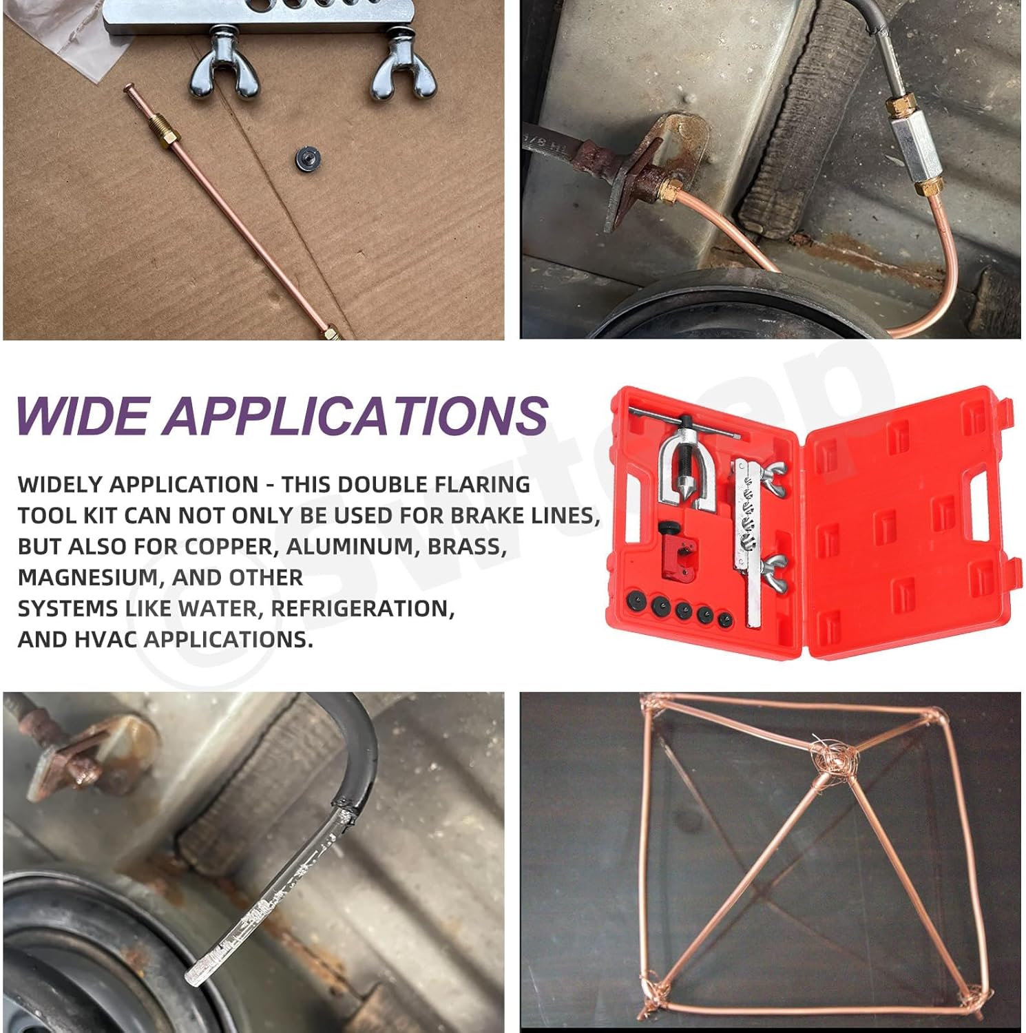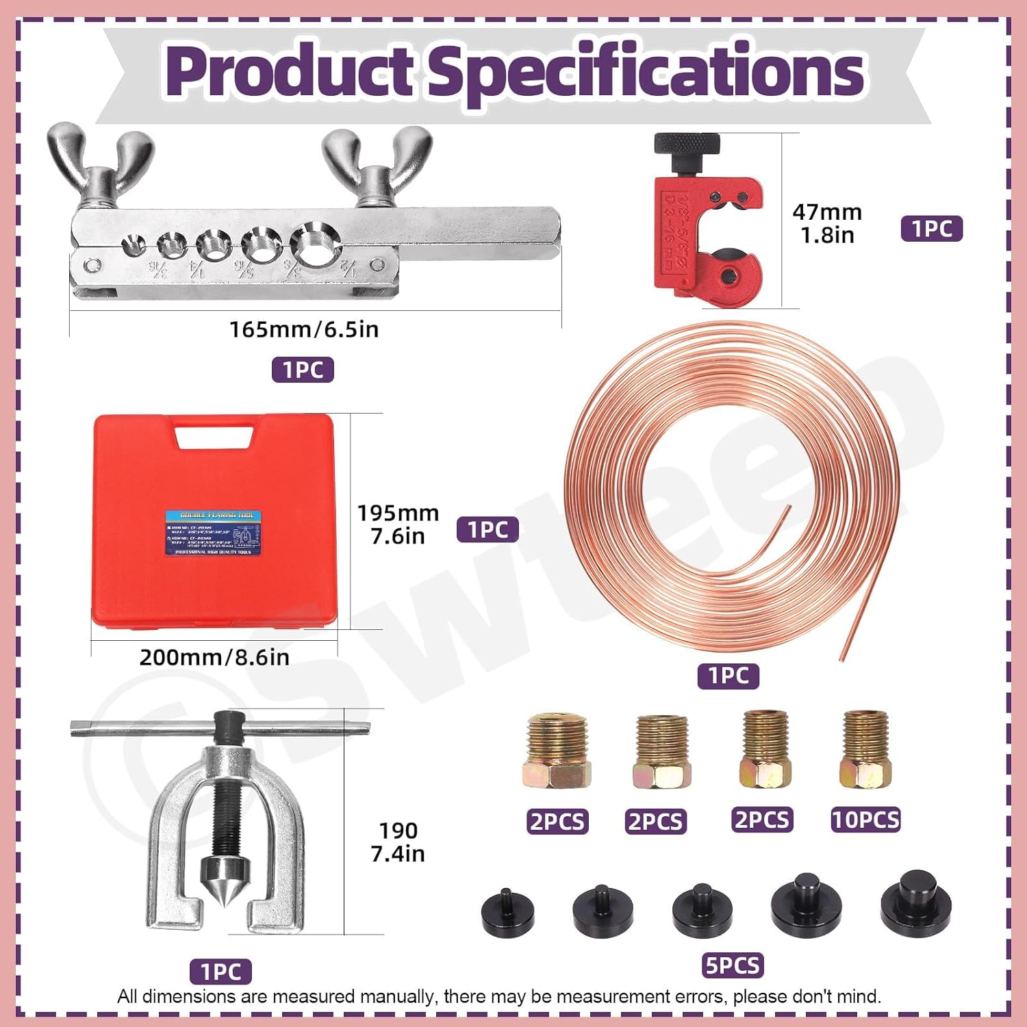 👑 Swpeet 30Pcs in Set Copper Coated Brake Line Kit, Brake Line with Flaring Tool Kit, Includes 16 Fittings and 4 Unions, Flaring Tool Set for Single and Double Flares with 5 Adapters and Tube Cutter 👑 Why Choose Us? 🏅 1.High-quality Material ✨ Our 3/16 Copper coated steel line are the longest lasting brake line and much better than standard steel tubing. Copper coated brake line are ideal for vehicles experiencing harsh weather and environmental conditions. 🏅 2.Wide Applications ✨ Brake line and fittings fits for most hydraulic braking systems, fuel systems and transmission systems,etc. It is also widely fit for household, industrial and commercial uses. 🏅 3. Please Note ✨ All dimensions are measured manually, there may be measuresment errors, please don't mind. 👑 Specifications: ✨ Material: Copper, Steel ✨ Size: 25Ft, 3/16”(7/16-24), 3/16”(1/2-20), 3/16"(9/16-18), 3/16" (3/8-24) ✨ Color: Copper ✨ Quantity: 30Pcs 👑 Package Includes: ✨ 1Pcs------- Blow-molded Case ✨ 1Pcs------- 25Ft Brake Line ✨ 1Pcs------- Flaring Cone ✨ 1Pcs------- Flaring Bar ✨ 1Pcs------- Tube Cutter ✨ 2Pcs------- 3/16”(7/16-24) Inverted Tube Nut ✨ 2Pcs------- 3/16”(1/2-20) Inverted Tube Nut ✨ 2Pcs------- 3/16"(9/16-18) Inverted Tube Nut ✨ 4Pcs------- 3/16" (3/8-24) Threads Unions ✨ 5Pcs------- Adapters ✨ 10Pcs------- 3/16" (3/8-24) Inverted Tube Nut ✨ In total 30Pcs