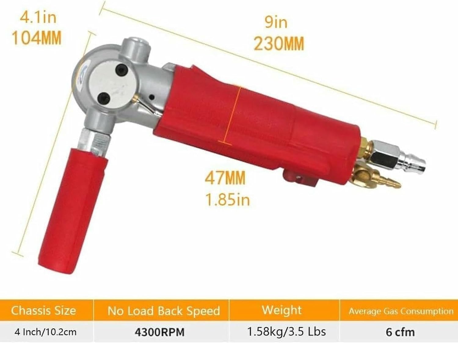 Description:Color: RedModel: BC-WS100Category: Straight Shank Pneumatic GrinderDisk diameter: 4inchNo-load speed: 4300 (rpm)Working pressure: 6-8 kgAir inlet size: 1/4 (inch)Recommended tracheal diameter: 8 * 5 (mm)Water pipe: 2.3mUse (applicable industry): stone, jade, ceramic polishingDimensions: 9*6.1*3.9 inTool net weight: 3.5 lbPackage include:1*Pneumatic Grinder1*wrench1*Water pipe