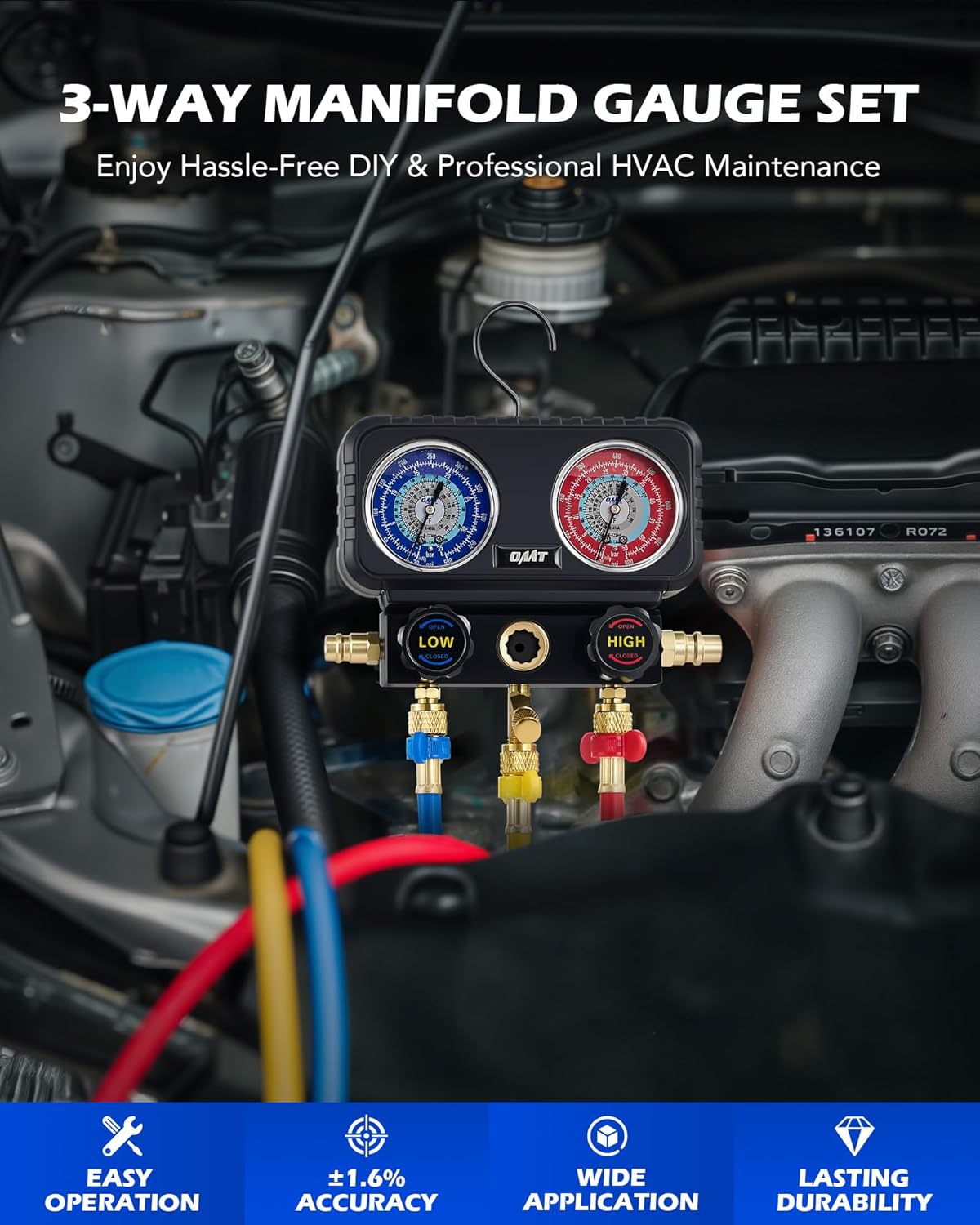 Orion Motor Tech Auto AC Vacuum Pump Kit & 3 Way Manifold Gauge Set for R1234yf R134a R410a Refrigerant, Bundle