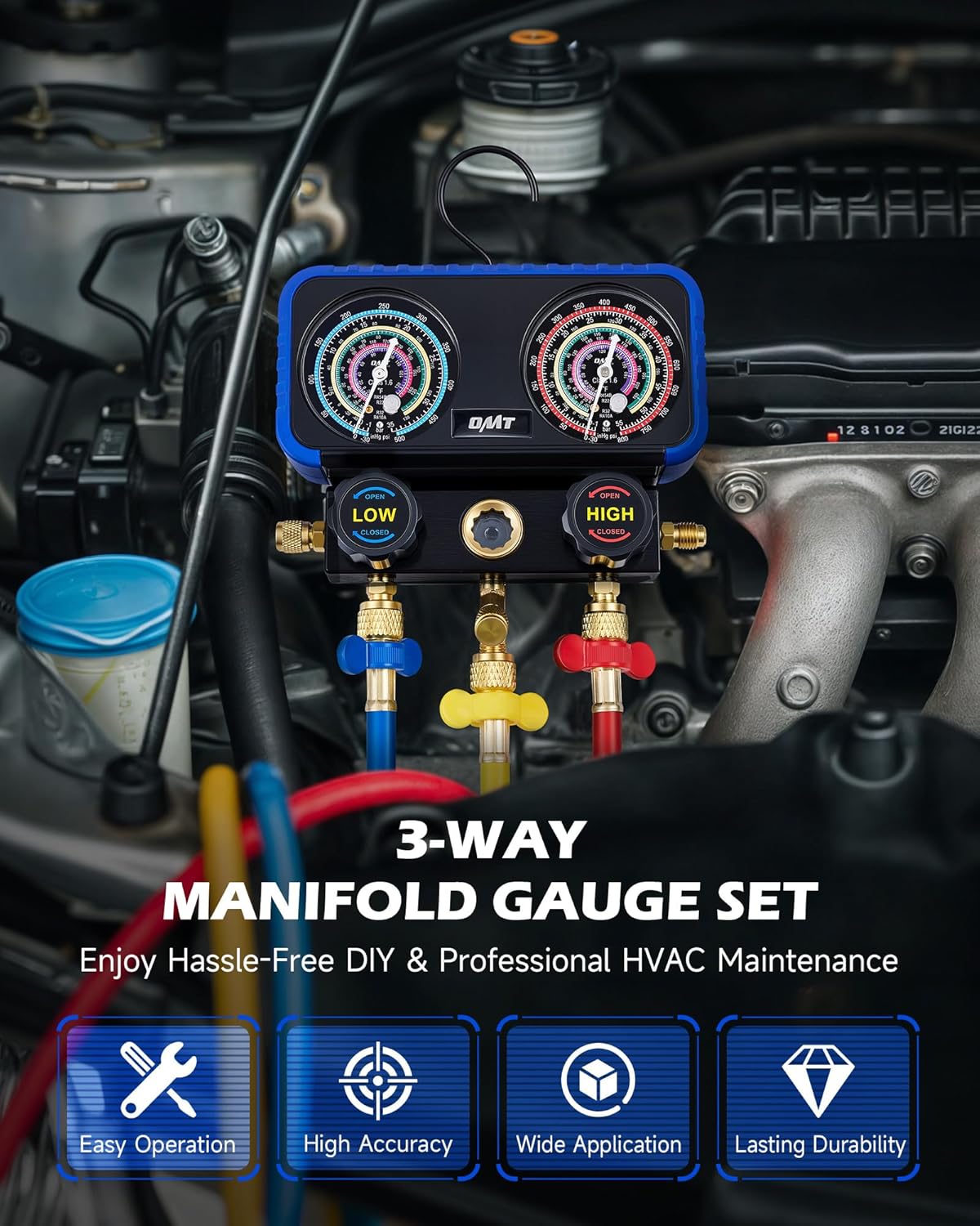 | Included Components | 1 x 3-Way Gauge, 3 x Hoses, 2 x Safety Valves, Adapters |