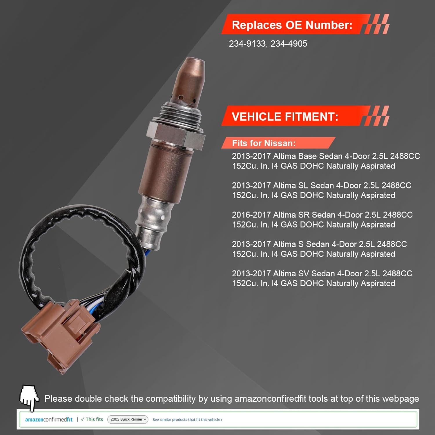 Key Features ✔ Support Proper Engine Operation & System Stability A malfunctioning oxygen sensor may be associated with drivability concerns and Check Engine Light warnings. This upgraded oxygen sensor is designed to: * Provide consistent oxygen signal feedback to the ECU * Support proper air-fuel ratio monitoring * Help maintain stable engine operation * Deliver consistent sensor response during normal driving conditions * Address common oxygen sensor–related warning indicators ✔ Fast Warm-Up & Stable Sensor Response * Rapid heating for quicker sensor activation * Reliable performance after cold starts * Consistent signal output under varying driving conditions * Stable response during city and highway driving * Designed for continuous post-start operation ✔ Durable Construction for Exhaust Environments * Advanced porous ceramic protective layer * Designed for stable signal performance over time * Suitable for high-temperature operating environments * Engineered to withstand vibration and thermal cycling * Built for long-term durability and reliable operation ✔ OEM-Quality Fit & Reliable Replacement * Manufactured to OEM design and production standards * Fully automated manufacturing with functional testing * Direct-fit replacement with no modifications required * OE-style connectors for secure installation * Consistent quality and dependable performance Replaces OE Number: 234-9133, 234-4905 ✔ Wide Vehicle Compatibility Fits for Nissan: 2013-2017 Altima Base Sedan 4-Door 2.5L 2488CC 152Cu. In. l4 GAS DOHC Naturally Aspirated 2013-2017 Altima SL Sedan 4-Door 2.5L 2488CC 152Cu. In. l4 GAS DOHC Naturally Aspirated 2016-2017 Altima SR Sedan 4-Door 2.5L 2488CC 152Cu. In. l4 GAS DOHC Naturally Aspirated 2013-2017 Altima S Sedan 4-Door 2.5L 2488CC 152Cu. In. l4 GAS DOHC Naturally Aspirated 2013-2017 Altima SV Sedan 4-Door 2.5L 2488CC 152Cu. In. l4 GAS DOHC Naturally Aspirated