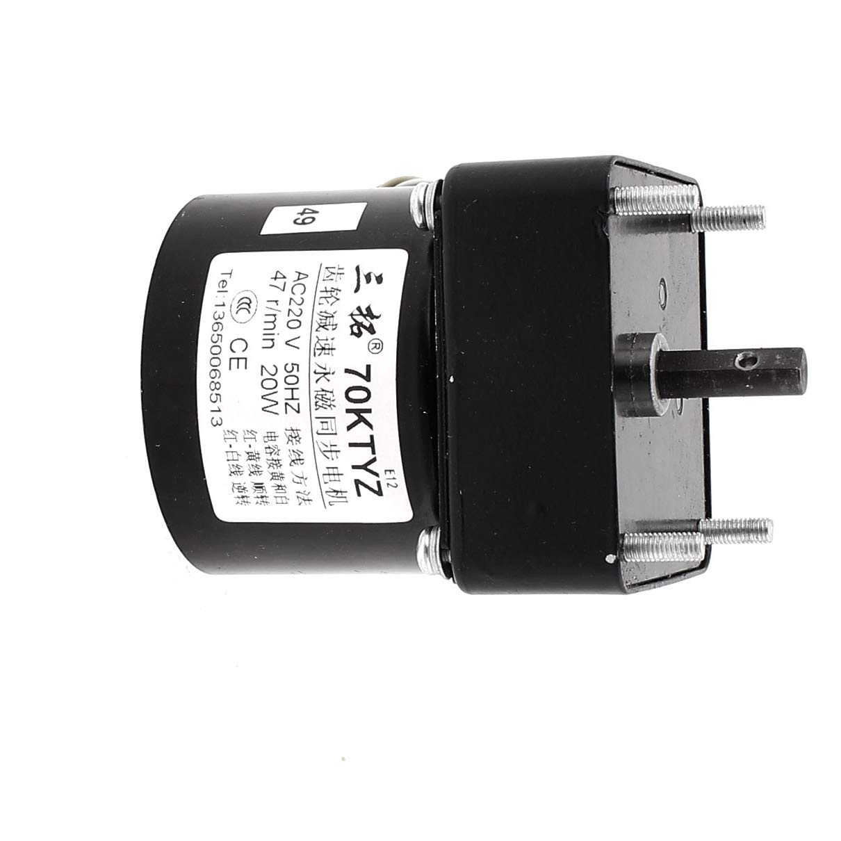 Aexit AC220V 47RPM High Torque Reversible Gear Motor Speed Reducer Shaft (3d004619706d112b83b3746e644fa4a4)1.These AC Synchronous Gear Motors are available with many different options in speed and torque. 2.perfect for applications that require a constant speed while connecting to AC power line voltage.3.Wire up the motor with the appropriate capacitor(included) to AC voltage, and the motor will maintain a constant speed as long as the load remains under the rated torque.4.Connection: Connect the capacitor with yellow and white wire. The red wire connects the yellow wire is CW; and another red wire connects white wire is CCW.5.Typical Aplications: electrical curtain, stage lights, advertisement electrical movement, electrical apparatus, mahjong desk, Automatic Equipment, Electric-drive toy, screen machine.Description in FrenchAC220V 47tr/min moteur réducteur réversible à couple élevé réducteur vitesse l'arbre excentriqueMax. Puissance nominale: 20W; Vitesse nominale: 47t/min, couple de sortie: 16kg.cm(1.6N.m); taille de l'arbre(excentrique): 8mm x 23mm (0.31" x 0.9")(D*L)La taille du moteur: 71mm x 71mm x 83mm (2.8" x 2.8" x 3.27")(L*D*H); Longueur totale: 109mm(4.29"); Longueur de câble: 18cm (7,08"); la du condensateur: AC500VCapacité: 0.68uF(+/-5%); pôle Condensateurs Longueur: 10cm(4"); Vis de montage Diamètre: 4.8mm(0,19"); Pays de fabrication: ChineMatériel: Métal, pièces électroniques; Poids net: 1087g; Contenu de l'emballage: 1 x moteur réducteur synchrone, 1 condensateur xModèle: 70KTYZ; couleur principale: Noir; Fréquence: 50Hz