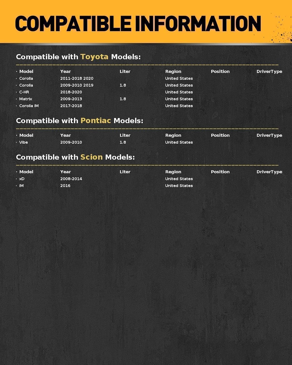 SPECIFICATION:Fitment Type: Direct ReplacementOE/OEM :HS26515PT, HBTO055 FITMENT :2009-2020 Corolla2018-2020 C-HR2009-2014 Matrix2008-2014 xD2017-2018 Corolla iM2009-2010 Vibe 1.8L2016 iMNote : Please enter your vehicle's year/make/model/Trim/Engine and check the fitment in "Your Garage" Package Includes: Glue*1Cylinder gasket*1Valve chamber gasket*1Seal*,25Exhaust gasket*1Oil seal*5Paper gasket*3Bolt*10Valve oil seal*16Throttle body gasket*1