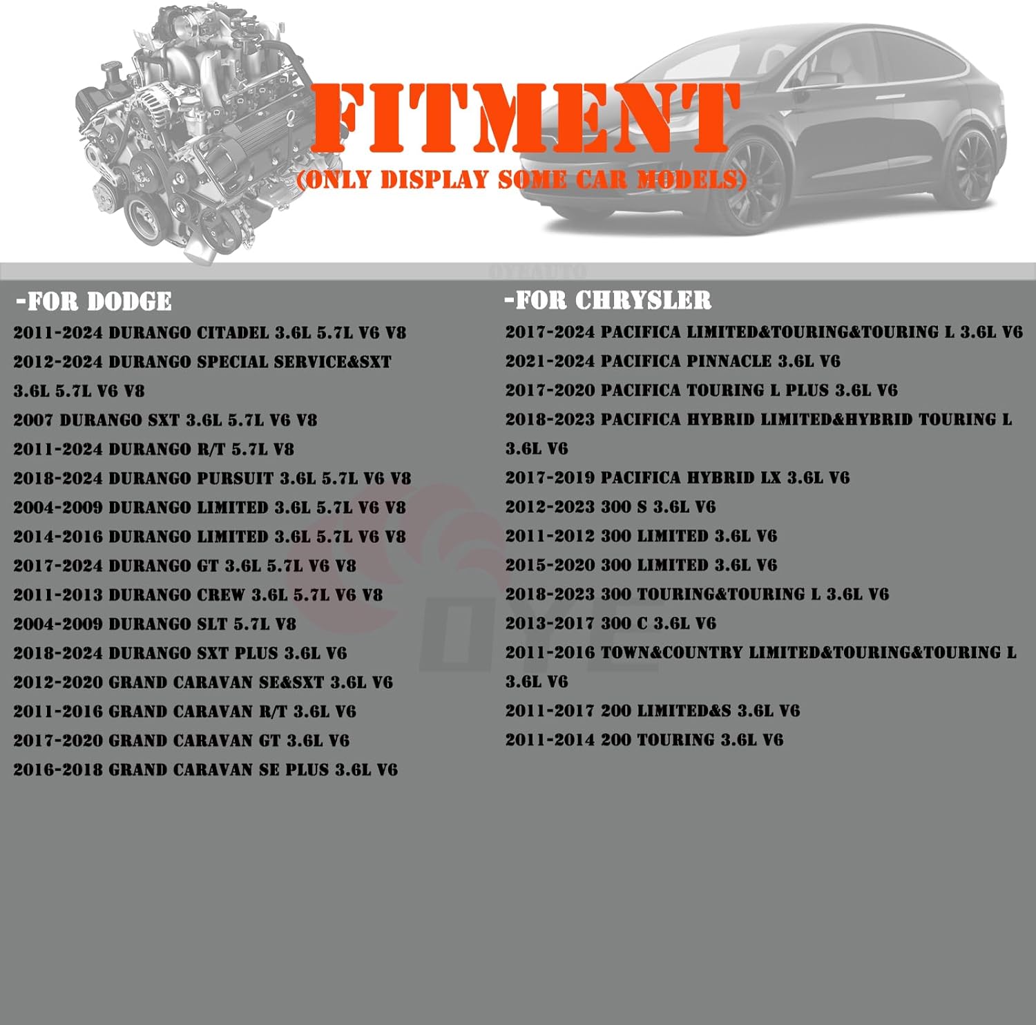 Fitment(Only display some car models):-For Jeep 2012-2024 Wrangler Unlimited Sahara&Rubicon&Sport&Unlimited Rubicon&Unlimited Sport 3.6L V62016 Wrangler Sport S&Unlimited Sport S 3.6L V62018-2024 Wrangler Sport S&Unlimited Sport S 3.6L V62021-2024 Wrangler Unlimited Sahara Altitude/Sport Altitude/Willys/Willys Sport/High Altitude 3.6L V62012-2017 Wrangler Sahara 3.6L V62011-2024 Grand Cherokee Limited&Overland&Laredo 3.6L V62014-2024 Grand Cherokee Summit 3.6L V62017-2024 Grand Cherokee Trailhawk 3.6L V62018-2024 Grand Cherokee Altitude 3.6L V62014-2022 Cherokee Limited&Trailhawk 3.2L V62014-2021 Cherokee Latitude 3.2L V62016-2020 Cherokee Overland 3.2L V62021-2024 Grand Cherokee L Altitude&Laredo&Limited&Overland&Summit 3.6L V6-For Dodge2011-2024 Durango Citadel 3.6L 5.7L V6 V82012-2024 Durango Special Service&SXT 3.6L 5.7L V6 V82007 Durango SXT 3.6L 5.7L V6 V82011-2024 Durango R/T 5.7L V82018-2024 Durango Pursuit 3.6L 5.7L V6 V82004-2009 Durango Limited 3.6L 5.7L V6 V82014-2016 Durango Limited 3.6L 5.7L V6 V82017-2024 Durango GT 3.6L 5.7L V6 V82011-2013 Durango Crew 3.6L 5.7L V6 V82004-2009 Durango SLT 5.7L V82018-2024 Durango SXT Plus 3.6L V62012-2020 Grand Caravan SE&SXT 3.6L V62011-2016 Grand Caravan R/T 3.6L V62017-2020 Grand Caravan GT 3.6L V62016-2018 Grand Caravan SE Plus 3.6L V6-Ram2013-2024 1500 Tradesman&HFE 3.6L V62014-2024 1500 Big Horn&Lone Star&Laramie 3.6L V62013-2018 1500 SLT 3.6L V62015-2024 1500 Rebel 3.6L V62014-2018 1500 Express 3.6L V62019-2024 1500 Classic Tradesman&Warlock 3.6L V62019-2023 1500 Classic Express&SLT 3.6L V62014-2024 ProMaster 3500/2500/1500 Base 3.6L V6-Chrysler2017-2024 Pacifica Limited&Touring&Touring L 3.6L V62021-2024 Pacifica Pinnacle 3.6L V62017-2020 Pacifica Touring L Plus 3.6L V62018-2023 Pacifica Hybrid Limited&Hybrid Touring L 3.6L V62017-2019 Pacifica Hybrid LX 3.6L V62012-2023 300 S 3.6L V62011-2012 300 Limited 3.6L V62015-2020 300 Limited 3.6L V62018-2023 300 Touring&Touring L 3.6L V62013-2017 300 C 3.6L V6