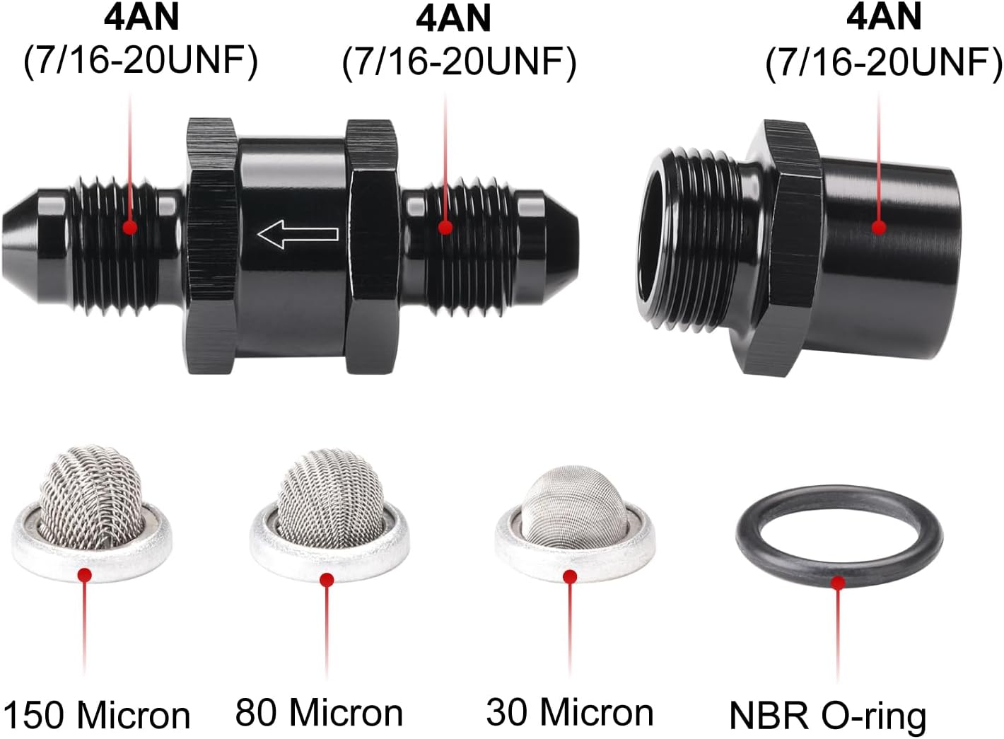 Specifications:Material: 6061 T6 billet aluminum filter housing and stainless steel filter elementsSize: AN4 (7/16x20 UNF). 44.4mm long x 17.1mm diameterSurface Treatment: Anodized blackFeatures: - These unique, flow directional filters can be configured with your choice of male 4AN flare inlet/outlet or with a female 4AN inlet and male 4AN flare outlet- Includes 30, 80 and 150 micron stainless steel elements allowing you to tailor the filter to suit your application- 30 micron recommended for light / medium weight engine oil and pump fuel; 80 micron recommended for heavy weight engine oil, alcohol and ethanol fuel systems; 150 micron recommended for power steering and transmission oil- Our filter assemblies deliver maximum filtration with minimal flow restriction, ensuring ultimate protection and performanceNotice: Professional installation is highly recommended! (No instructions included)