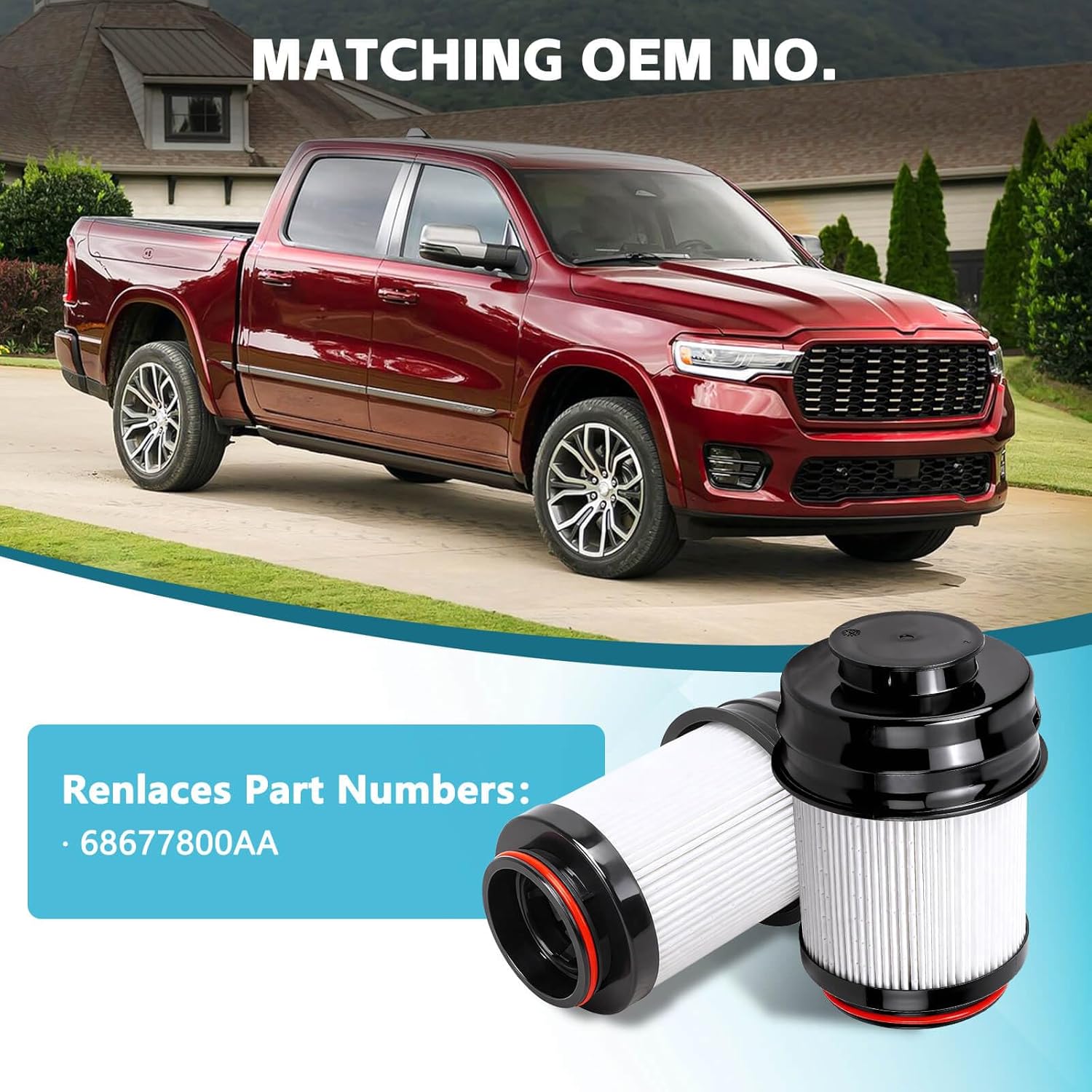 【Compatible With】The fuel filter/water separator set is compatible with 2025 2026 Ram 2500, 3500, 4500, and 5500 models with the 6.7L Cummins Turbo Diesel engine. Replacement part number: ## 68677800AA