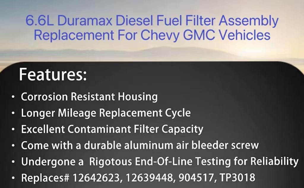 Replacement For: 2005-2012 Chevy Silverado 2500 HD 2007 Chevy Silverado 2500 HD Classic 2005-2006 Chevy Silverado 3500 2007 Chevy Silverado 3500 Classic 2007-2012 Chevy Silverado 3500 HD 2005-2012 GMC Sierra 2500 HD 2007 GMC Sierra 2500 HD Classic 2005-2006 GMC Sierra 3500 2007-2012 GMC Sierra 3500 HD Replaces OE#: 12642623, 904517, 904-517, 12633244, 12639448, 12664429, 12639277, TP3018 Package Includes: 1x TP3018 Fuel Filter; 1x 12642623 Fuel Filter Head, 1x 12639277 Water In Fuel Indicator Sensor
