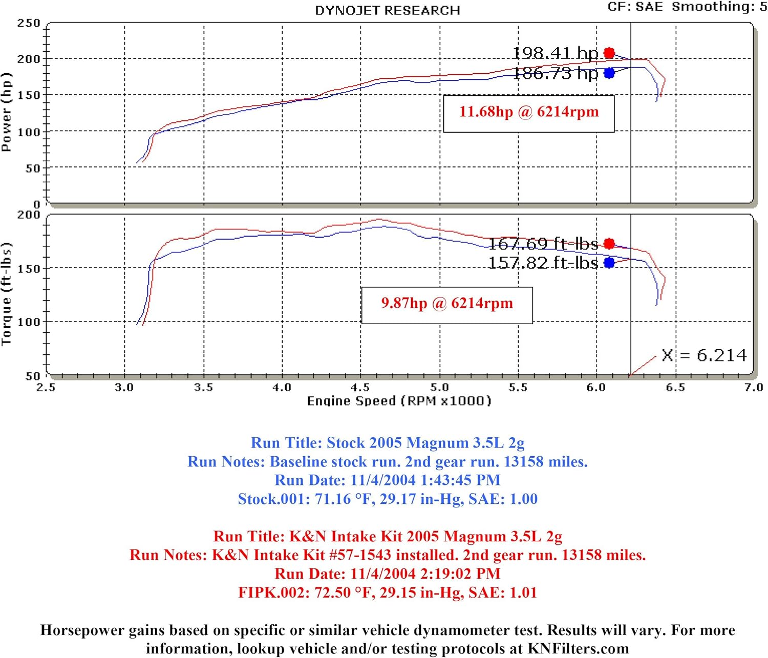 K&N is the inventor of the Air Intake System and has over 50 years of experience in the performance filtration industry. Proudly designed and manufactured in the USA, this premium cold air intake system is specifically designed for your vehicle and is dyno tested to provide a guaranteed increase in horsepower. It features a high flow intake tube, custom heat shield, and oversized K&N Washable High-Flow Cotton Air Filter for ultimate airflow. This Intake system replaces the restrictive OEM air box to provide an improved driving experience for daily driving or towing. It installs easily in about 60 minutes and is backed by a No-Hassle Lifetime Limited Warranty and will not void your factory warranty. Legal for use in all 50 states.Compatible Vehicles:2005-2010 CHRYSLER 3002009-2010 DODGE Challenger2006-2010 DODGE Charger2005-2008 DODGE Magnum