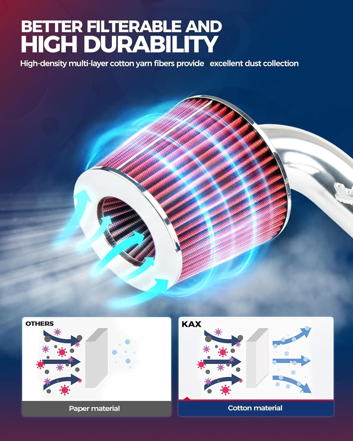 • REUSABLE DESIGN: The reusable cold air intake filter with combines 2 layers of pleated, breathable cotton with filter oil to absorb dirt and dust particles, allows clean air to continue to flow into your engine, requiring cleaning only once every 100,000 miles under normal highway driving conditions.