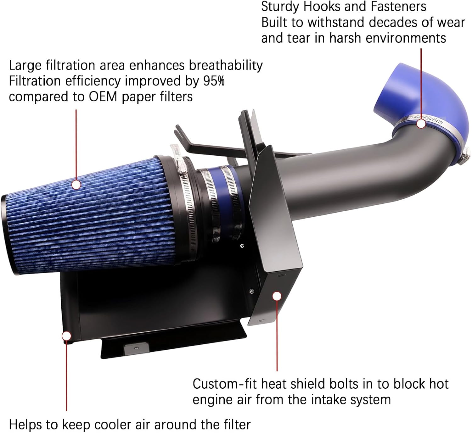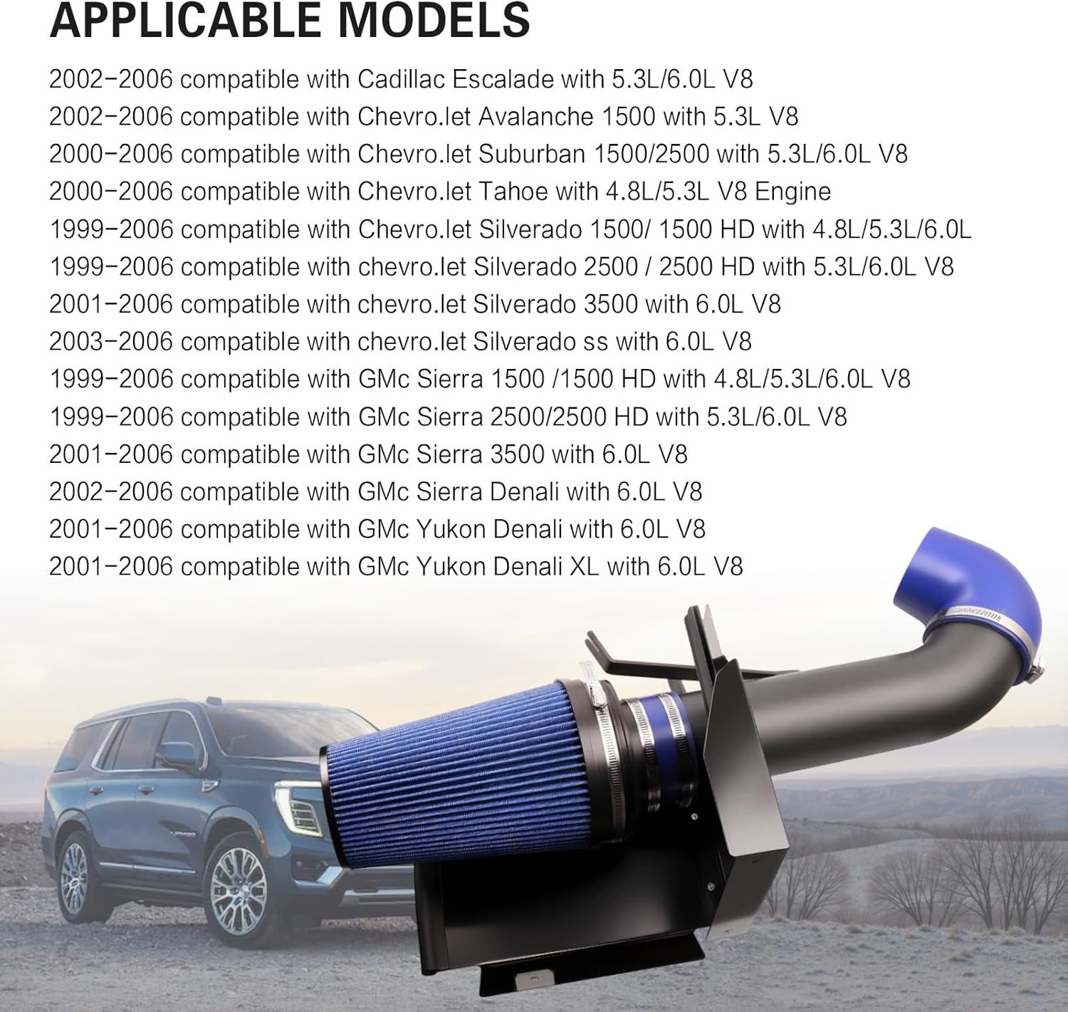 This high-performance cold air intake system is engineered to maximize your engine's potential by delivering cooler, denser air for improved combustion. Designed specifically for 1999-2006 GMC, Chevy, and Cadillac vehicles equipped with V8 4.8L, 5.3L, or 6.0L engines, including Silverado 1500, 2500, and 3500 models, this intake system features a sleek black powder-coated finish that resists corrosion and adds a professional appearance under the hood. The extra-large synthetic media and steel mesh air filter provides up to 95% filtration efficiency, significantly outperforming standard OEM paper filters while allowing increased breathing capacity. The custom bolt-in heat shield blocks hot engine air from reaching the intake, helping to maintain cooler air temperatures around the filter for optimal performance gains. This straightened and smoothed airflow design can increase horsepower by 5-10% and torque by 6-8%. Built with durable clamps and brackets to withstand years of abuse under extreme conditions, this complete kit includes everything needed for installation: filter shield, air filter, intake tube, rubber vibration mount, various couplers, hose clamps, locknuts, allen bolts, washers, and fender washers.