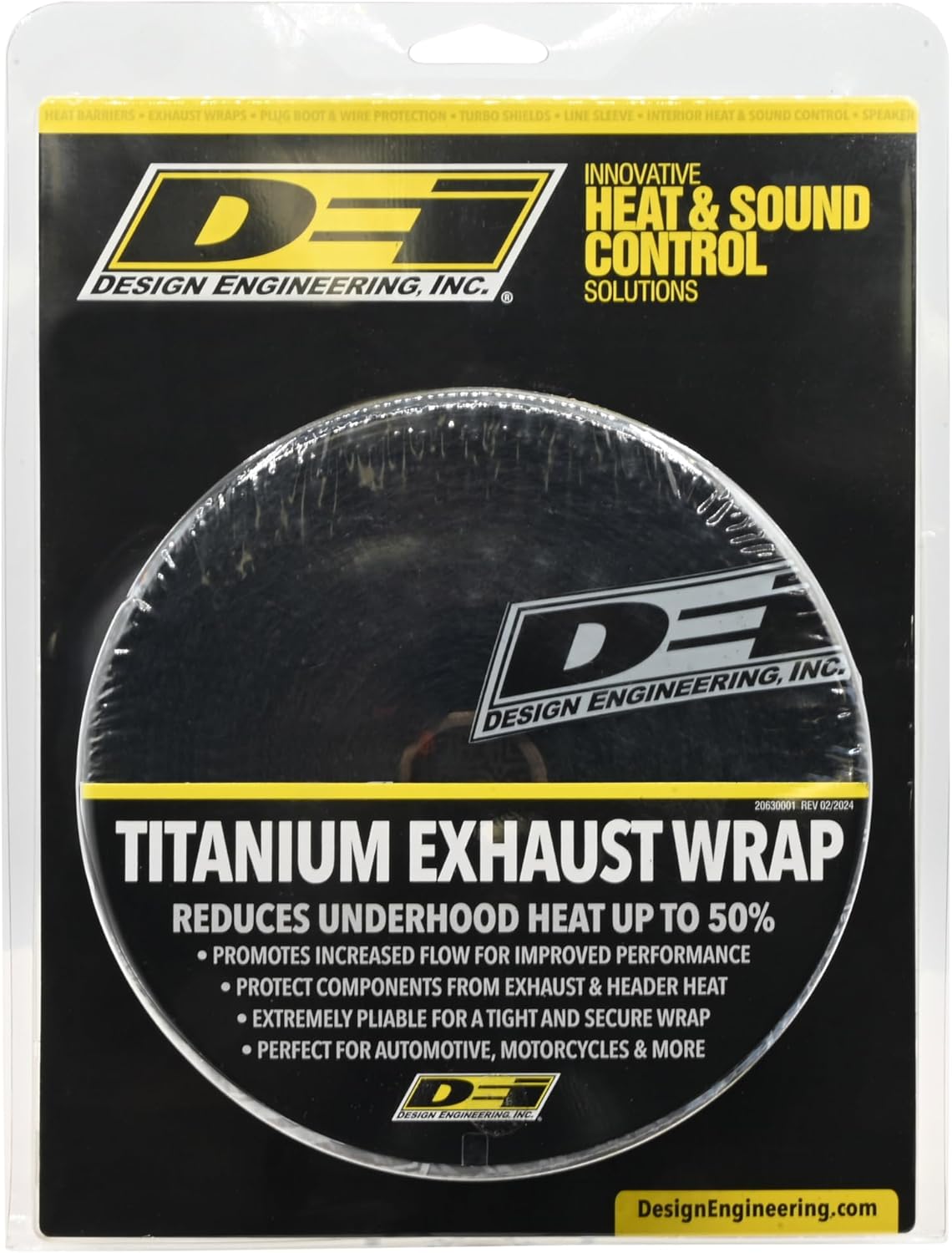 Design Engineering, Inc. Black Titanium Exhaust Heat Wrap with Lava Rock Technology is a high-performance, pliable exhaust wrap tape designed to handle extreme temperatures and reduce under-hood heat by up to 50%. Made from pulverized lava rock fibers interwoven with fireproof materials, this premium wrap withstands continuous direct heat up to 1800°F and intermittent spikes up to 2500°F, protecting exhaust pipes, wiring, and nearby components while maintaining high exhaust gas velocity for improved performance and horsepower gains. The proprietary weave allows easy installation around bends and curves, while its chemical, oil, and vibration-resistant design ensures long-term durability. Ideal for automotive, marine, powersports, and industrial applications, DEI’s Titanium Exhaust Wrap lowers intake air temperatures, reduces heat soak, shields sensitive components, and enhances overall system efficiency. Made in the USA with over 30 years of expertise in heat and sound control, this exhaust wrap delivers professional-grade performance, protection, and reliability.