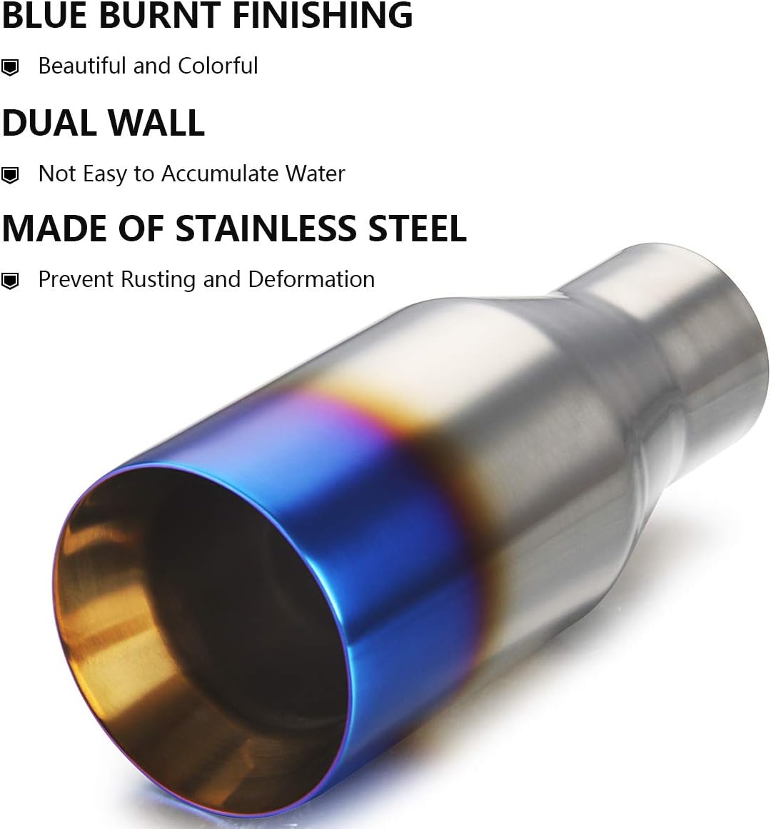 Specification: ★ Inlet Diameter: 2.5inch ★ Outlet Diameter: 4 inch ★ Overall Length: 9 inch ★ Surface Finish: Vacuum Plating Blue ★ Material: Stainless Steel ★ Installation Type: Weld On ★ Exhaust Type: Dual Wall Material: High quality stainless steel infused with anti-corrosive agents that prevent your tailpipe from rusting. Design: Dual Wall, not easy to accumulate water and prevent rust. Installation: It is recommended to go to a nearby shop for professional installation. Service: Whether it's an order problem or a product problem, please feel free to contact us. Note: Please check the size of your vehicle’s tailpipe before purchasing. Package Includes: 2 PCS Exhaust Tip