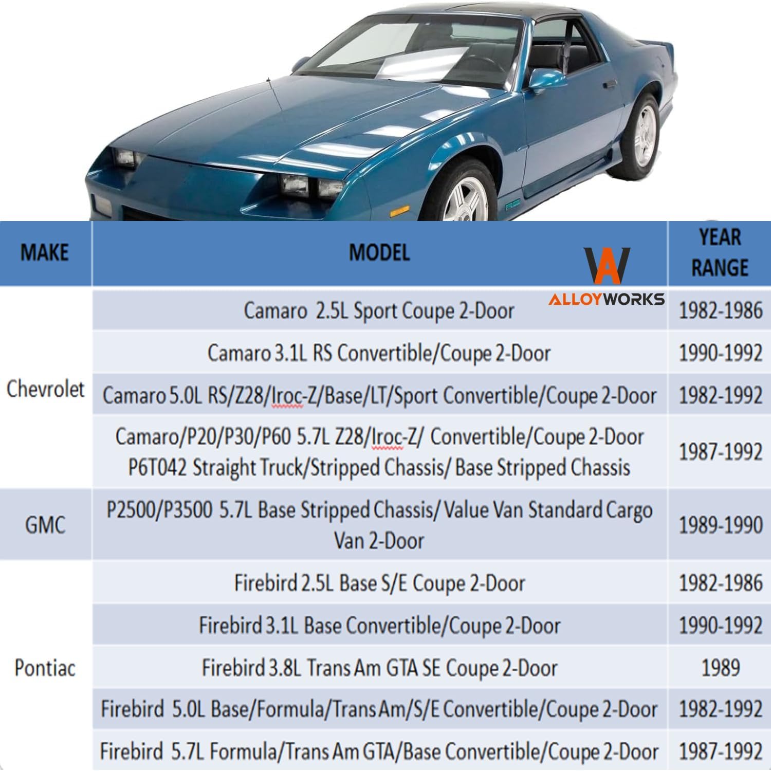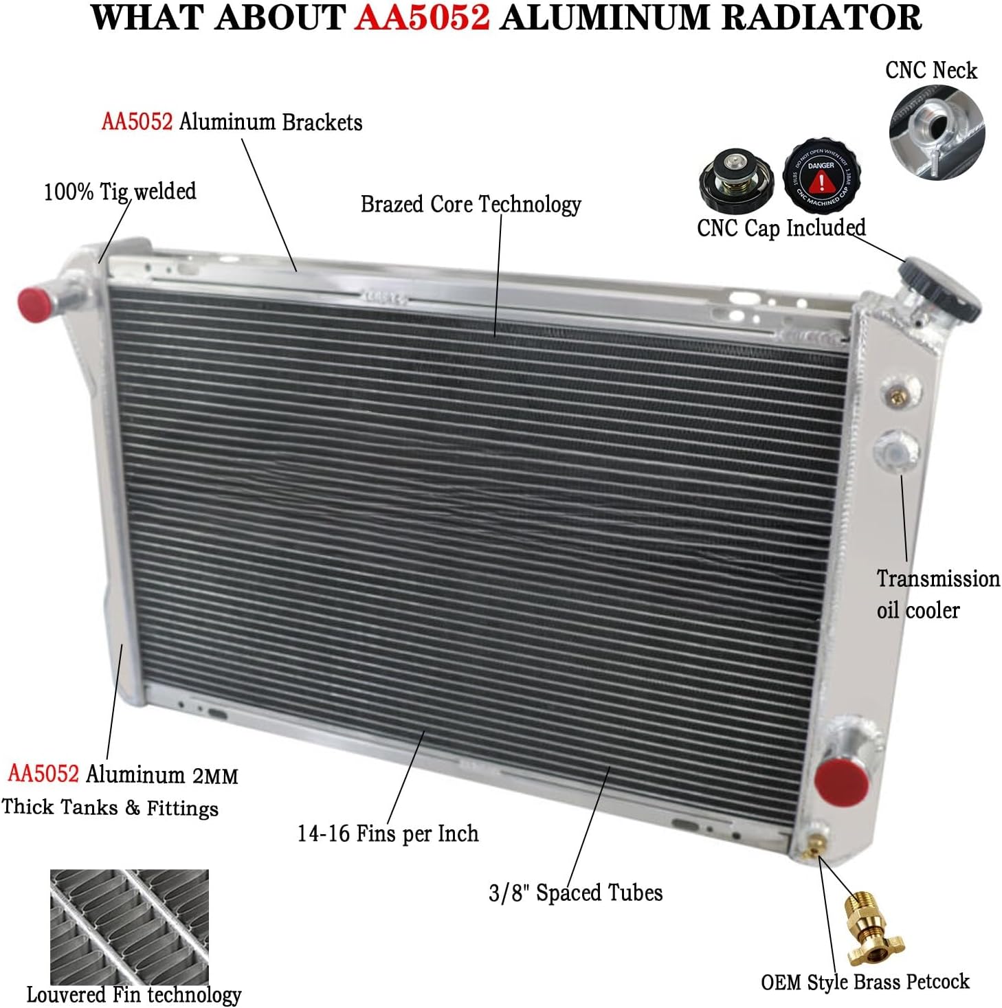 Radiator Fitment: For Engines using 26-1/4" Wide core Radiator onlyVehicle Fitment:For Chevrolet Camaro Base 5.0L V8 1988For Chevrolet Camaro Berlinetta V8 5.0L 1982-1986For Chevrolet Camaro Iroc-Z V8 5.0L 1985-199V8For Chevrolet Camaro Iroc-Z V8 5.7L 1987-199V8For Chevrolet Camaro LT V8 5.0L 1987For Chevrolet Camaro RS V6 3.1L 9V8-1992For Chevrolet Camaro RS V8 5.0L 1989-1992For Chevrolet Camaro RS Heritage Edition V6 3.1L 92For Chevrolet Camaro RS Heritage Edition V8 5.0L 92For Chevrolet Camaro Sport V8 5.0L 1982-1987For Chevrolet Camaro Sport L4 2.5L 1982-1984For Chevrolet Camaro Z28 V8 5.0L 1982-1992For Chevrolet Camaro Z28 V8 5.7L 91-1992For Chevrolet Camaro Z28 Heritage Edition V8 5.0L 92For Chevrolet Camaro Z28 Heritage Edition V8 5.7L 92For Chevrolet Camaro Z28 Indianapolis 5V8V8 Pace Car V8 5.0L 1982For Chevrolet P20 Base V8 5.7L 1989For Chevrolet P20 Step-Van V8 5.7L 1989For Chevrolet P30 Base V8 5.7L 1989-199V8For Chevrolet P30 Step-Van V8 5.7L 1989-199V8For GMC P2500 Base V8 5.7L 1989For GMC P2500 Value Van V8 5.7L 1989For GMC P3500 Base V8 5.7L 1989-199V8For GMC P3500 Value Van V8 5.7L 1989-199V8For Pontiac Firebird Base V6 3.1L 199V8-1992For Pontiac Firebird Base V8 5.0L 1982-1992For Pontiac Firebird Base V8 5.7L 1987For Pontiac Firebird Formula V8 5.0L 1989-1992For Pontiac Firebird Formula V8 5.7L 1989-1992For Pontiac Firebird S/E V8 5.0L 1982-1986For Pontiac Firebird Trans Am V8 5.0L 1982-1992For Pontiac Firebird Trans Am V8 5.7L 1987-1992For Pontiac Firebird Trans Am V6 3.198L 1989For Pontiac Firebird Trans Am GTA V8 5.0L 1989-1992For Pontiac Firebird Trans Am GTA V8 5.7L 1989-1992For Pontiac Firebird Trans Am GTA SE V6 3.198L 1989Radiator Size:Condition:NewHigh Performance Racing Spec.3 Row of tubes Core Racing DesignPetcock Drain:OEM style brass petcock drainCore Size: 26 1/4" W x 16 4/9" HOverall Size:32" W x 19 1/2" HTank Size: 2 1/2 x 18 5/8Inlet Hose Connection: 1 1/4" Driver SideOutlet Hose Connection: 1 1/2" Passenger SideTransmission Oil Cooler: ¢26×290×M12*1.25(Z)Tank Material: AA5052 AluminumCore Material: AA5052 AluminumHigh Performance Racing Spec.Mounting Style: Bolt-OnRadiator style: DownflowFit type: Vehicle SpecificCrafts: 100% Tig weldedDelivery: Local DeliveryFitment Type: Direct ReplacementPerformance: Up to 30%~45% more coolingPlacement on Vehicle: Engine CompartmentSurface Finish: Aircraft Grade Raw AluminumPetock Drain: OEM style brass petcock drainRadiator Cap: CNC machined filler neck and capFANS:Volt :12vMaximum Fan CFM: 1730 cfmFan Diameter (in): 12.050”Thickness (in): 2.500”Number of Blades: 10 S-Type bladeMaximum Fan RPM: 2,250 rpmBlade Material: PlasticAmp Draw: 12.70 ampsIncludes the Mounting Tabs for an Easy Zip Tie InstallationThermostat Kit Installation:Universal fit for any automotive vehicle and electric fan.Activates by grounding electric fans at preset temperature.180'F turn-on temperature, 165'F turn-off temperature.Probe typically threads into radiator, water outlet or manifold.RED + connect directly to battery.WHITE wire to ignition switch power source.BLACK goes to thermos switch.BLUE wire goes to the Fans.Package Include:1 X 3 Row AA5052 Aluminum Radiator1 X CNC Machined Radiator Cap1 X AA5052 Aluminum Shroud2 X 12" Fans (Includes mounting kits)1 X Thermostat Relay Kit