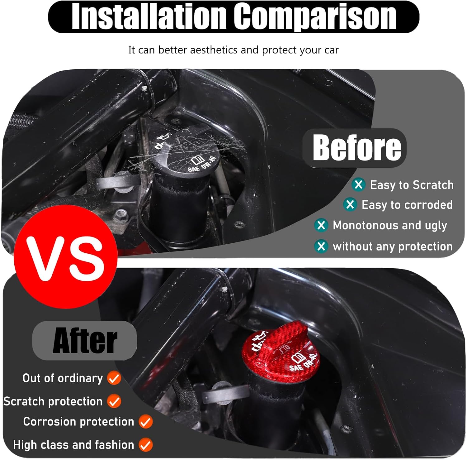 Suetlcoity offers a wide range of accessories to enhance and upgrade both the look and function of your vehicle . We sincerely appreciate your decision to purchase our products, we always committed to providing the high-quality, safe automotive decorative products and the excellent ,professional and customer service.📌Item Description:Applicable Model: Compatible with Corvette C7 C8 2014 2015 2016 2017 2018 2019 2020 2021 2022 2023 2024 2025 Condition:Brand NewMaterial: unlike traditional abs material, is made of real carbon fiber material. It is not easy to wear and tear, will not be deformed, effective anti-scratch, and has a long service life.not only improves the monotonous or faded look of car's Engine location It also easily improves friction. It feels better when you turn the cap by hand. 📢Attention:Please check whether this item can fit on your car before purchasing.if you meet any problems when using our devices, please feel free to contact us and our staff will reply in 24hrs.💡Installation method:Step1.Wipe the surface where you want to stick. Keep dry and clean .(Very important)Step2. Determine the installation location and then make comparison of the product and installation location. If the product doesn’t fit your vehicle, please contact us immediately and do not install.Step3.Remove the protective film from the Double-sided tape on the back of the product. For better results, it is recommended to heat the double-sided tape with a hairdryer or lighter.Step4.Paste the accessories in the corresponding position and you can use the edge of a sheet of credit card to help press it to make sure the adhesive sticks firmly.🎁Package Include:1pc/set of Suetlcoity Carbon Fiber Engine Oil Filler Cap Suetlcoity will also produce other automotive accessories, please check our store for details.