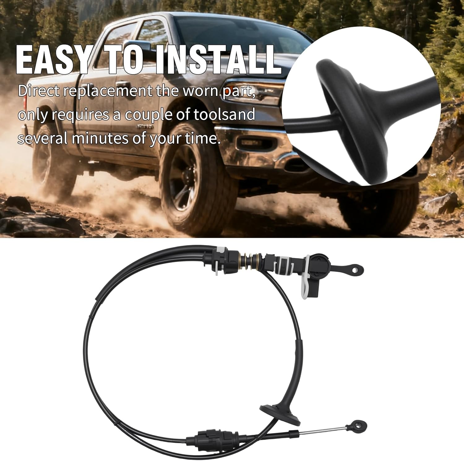 Product Specifications Product Type: Automatic Transmission Shift Cable Fitment: Replacement for Ram 1500 (2002-2008) Replacement for Ram 2500 (2003-2009) Replacement for Ram 3500 (2003-2010) Replaces Part Number: 52107847AM Color: Black Material: High-strength metal and flexible plastic Installation Method: Routing from transmission to gear shifter with secure attachment Function: Connects gear shifter to transmission for smooth gear changes