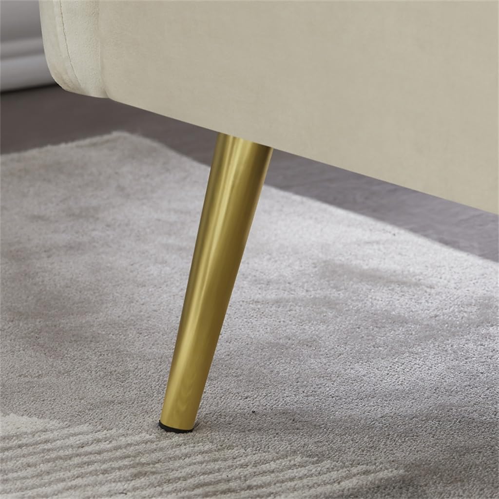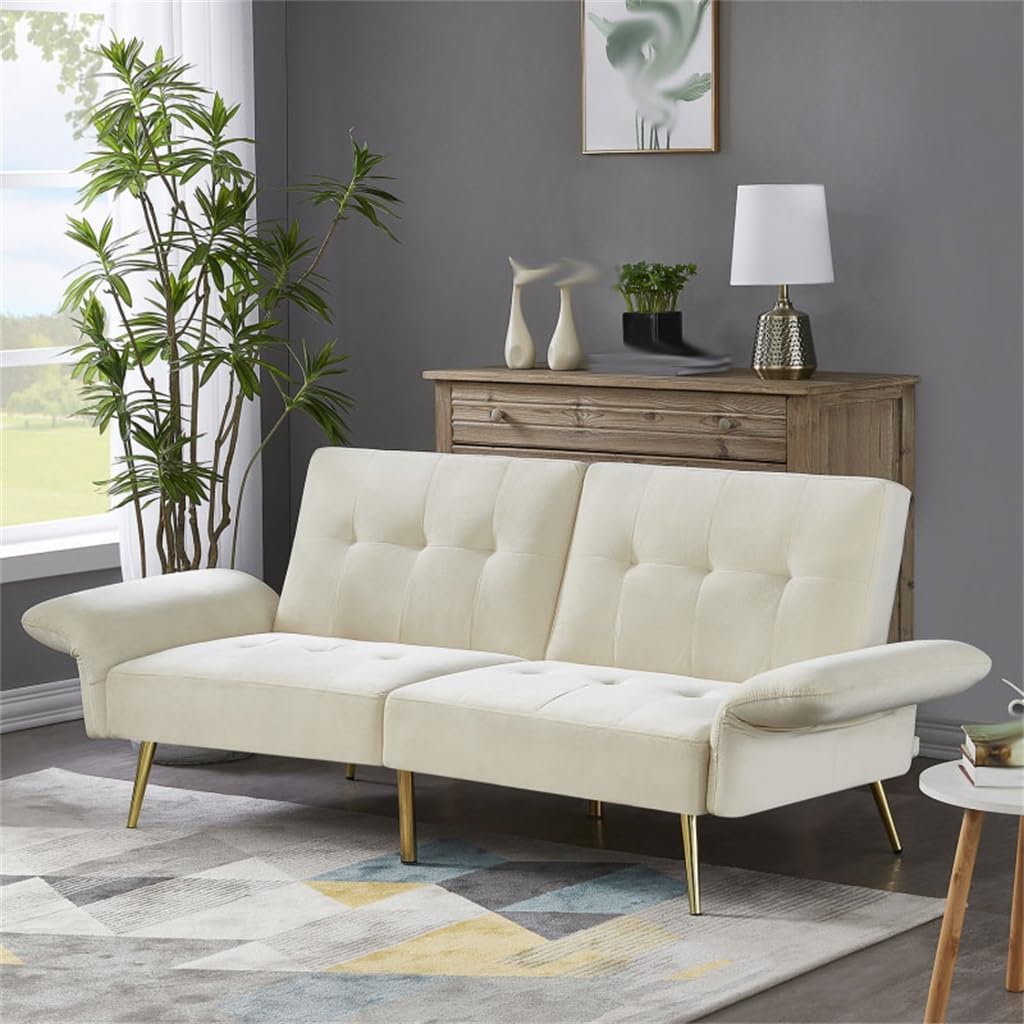 77.5 length when its armrests are folded down to adapt an adult sleeping. You don't need to bend your legs or put feet outside the sofa to suit for limited sofa width.filling foam in armrests makes it softer. It is comfortable enough for when sleep on. You do not need to prepare extra pillows.Storage bags are set on the outside of armrests. It is a very practical design that you can put the TV remote controller, magazines or some others in it.The backrests are foldable into 3 positions. The left and right backrests are controlled independently to meet different needs when you sit on it with your friend.The gold stainless feet are trendy . It can be perfectly match various living room styles.Cover Material:280G velvetFilling:FoamFrame type:Solid Wood + PlywoodLeg type:MetalWeight Capacity:600LBSSize: as shownSet Includes1*sofa(no other presentation items included).Notice:1. Due to manual measurement, please allow 2-3% error, before you bid, please make sure you don't mind.2. The color may vary due to different displays, please refer to the actual product.