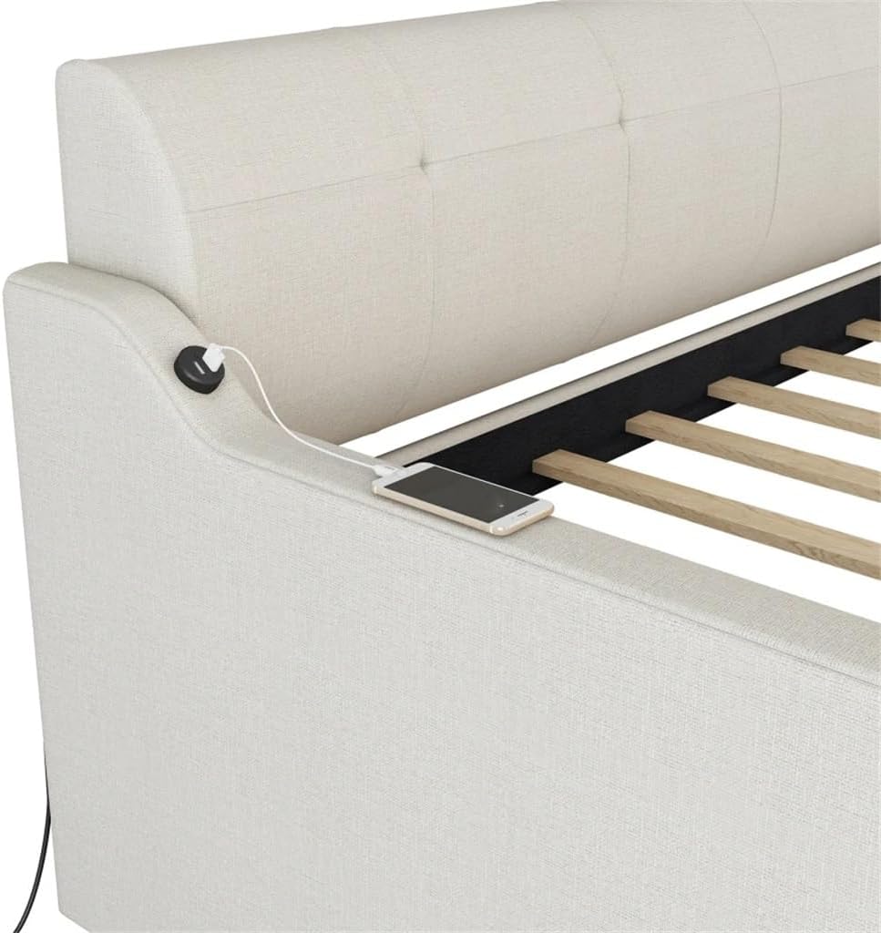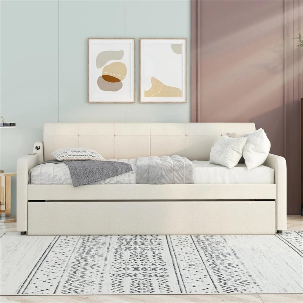 Upholstered in woven fabric, in elegant beige, features a backrest and two armrests with soft materials, this daybed not only suits any home décor but is timeless in its design.The daybed frame is made of solid MDF and particleboard, providing dense and strong support. The construction ensures both a of use and a sturdy frame with a backrest that won’t wobble.The daybed with a handy pull-out trundle takes up minimal space for the spontaneous sleepover guest.And it can be laid directly on the ground, or it can be erected at the same height as the daybed.The right armrest also has a charging design. When you are lying on the sofa and your phone is out of power, you can charge your phone in time.All parts included in your package are indicated clearly. With step-by-step installation manual and per-drilled holes, you can easily assemble this side table individually.Manual installation is recommended.Bed MaterialPine Wood+MDF+Woven FabricSize: as shownPackage Included:Sofa Bed*1, No Mattress Included.(no other presentation items included).Notice:1. Due to manual measurement, please allow 2-3% error, before you bid, please make sure you don't mind.2. The color may vary due to different displays, please refer to the actual product.