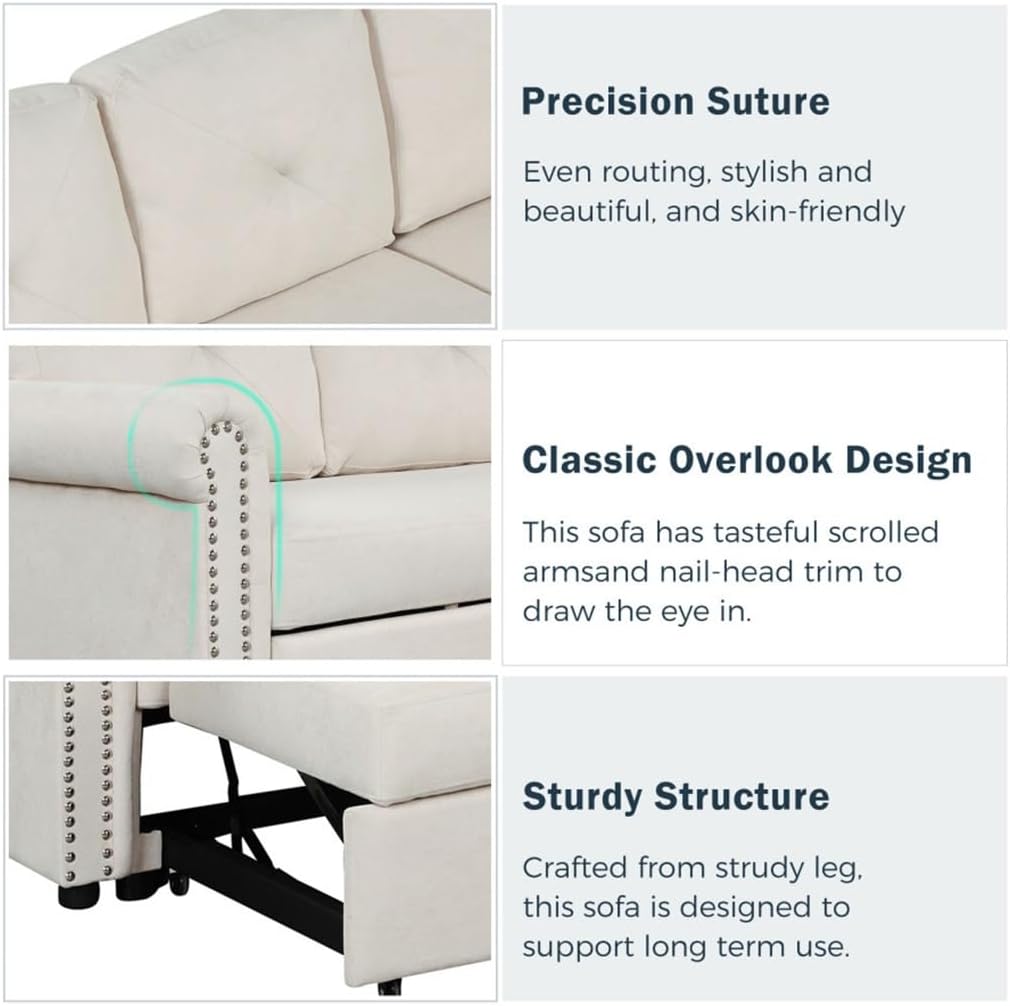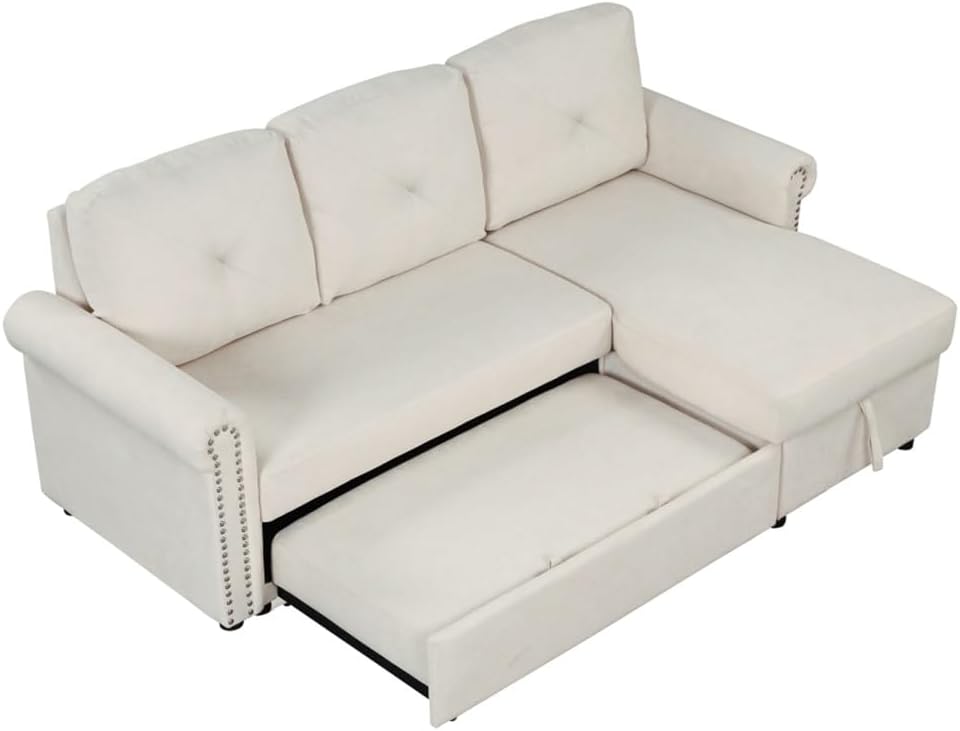 AND VERY STURDY: Velvet fabric and high-density foam create plump, clean lines, and the backrest is ergonomically designed to make you feel supported and comfortable.The scrolled arms insetting with nail- design makes this convertible modular couch set full of fashion . This set includes a left corner seat, right facing corner seat. The chaise of the couch can be either right or left side. You can build the position and shape you like. The tail of the sofa bed is pulled out in a drawer type, the equipped portable handle with the assistance of the bottom pulley device to quickly complete the bed transformation. It can meet your various needs and no longer worry about unexpected guests. Our sofa is soft with comfy high density foam cushions for ultimate comfort and support. Optimal softness with extra padded cushioning gives sofa relaxing feeling.Upholstery Material VelvetFrame Material PlywoodSeat Construction Sinuous Springs+FoamLeg Material PlasticSize:As shownSet Includes1*Sofa Bed(no other presentation items included).Notice:1. Due to manual measurement, please allow 2-3% error, before you bid, please make sure you don't mind.2. The color may vary due to different displays, please refer to the actual product.