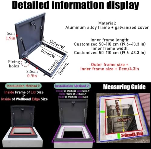 Discover our premium escape hatch cover, designed to enhance safety and accessibility in your home. Perfect for basements, cellars, or emergency exits, this versatile product provides reliable access to roof spaces while ensuring peace of mind during emergencies. **Specifications:** - **Product Type:** Escape hatch cover, basement exit cover, emergency access lid, wellhead cap - **Material:** Durable galvanized steel panel with a sturdy aluminum frame - **Customizable Colors:** Available in black and gray to suit your aesthetic - **Size Options:** Tailor the inner diameter to your specifications - **Dimensions:** Bottom frame inner diameter size ranges from 51-101 cm (20-40 in) with an outer frame size that adds an additional 11 cm (4.3 in) **Installation Made Easy:** - **Pre-Drilled Holes:** Designed for straightforward installation, saving you time and effort - **User-Friendly Handle:** Features a pull handle that allows for effortless opening and closing - **Wide Opening Angle:** Supports a maximum lid opening of 90°, providing easy access when needed - **Secure Door Latch:** Equipped with a latch design that locks the hatch securely to deter unauthorized access **Package Includes:** - Roof Hatch x 1 - Bolts for installation **Safety Tips:** For optimal safety during installation, we recommend wearing gloves to prevent scratches. Please note that this product is manually measured, and minor size variations of up to 1 cm (3/8 in) may occur. Due to different lighting and photography conditions, actual product colors may vary slightly. Transform your space with our reliable escape hatch cover, combining convenience, security, and customization to meet your unique needs. Whether for renovation projects or emergency preparedness, this product ensures you are always ready for any situation.
