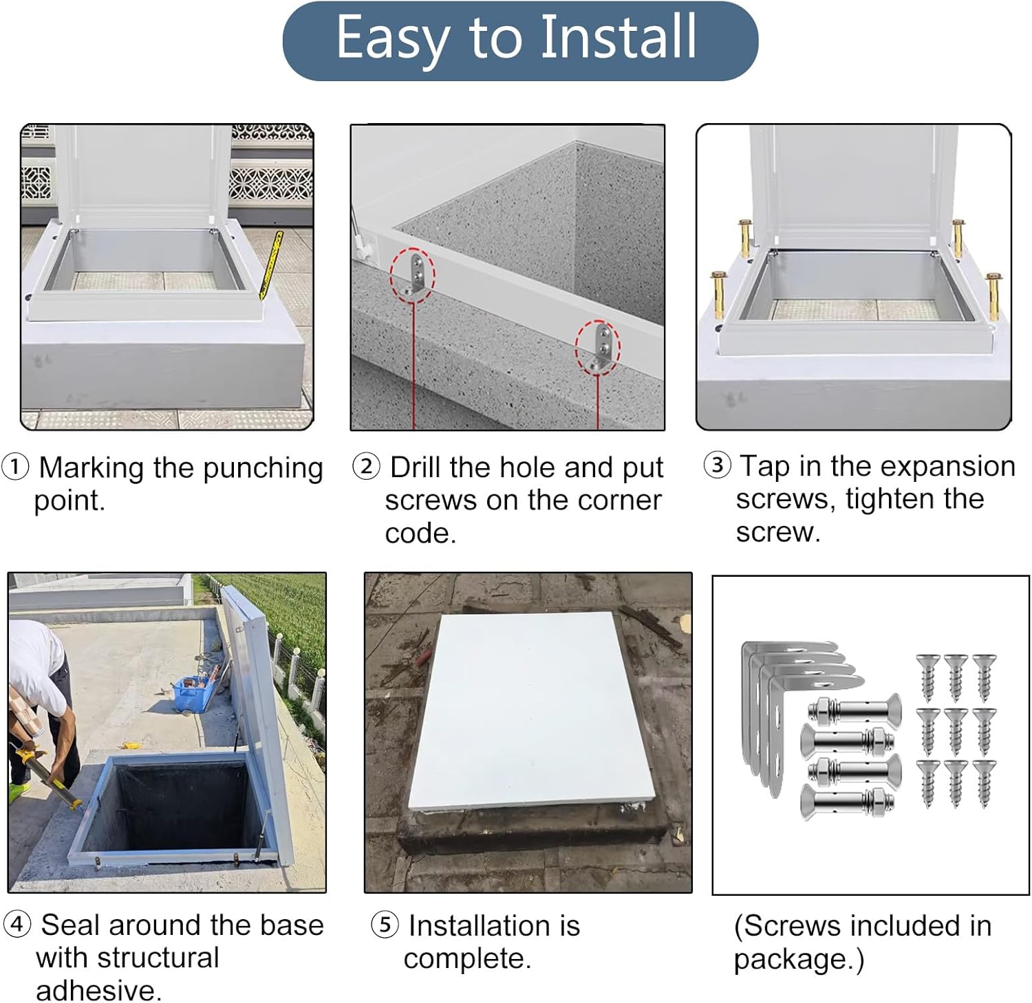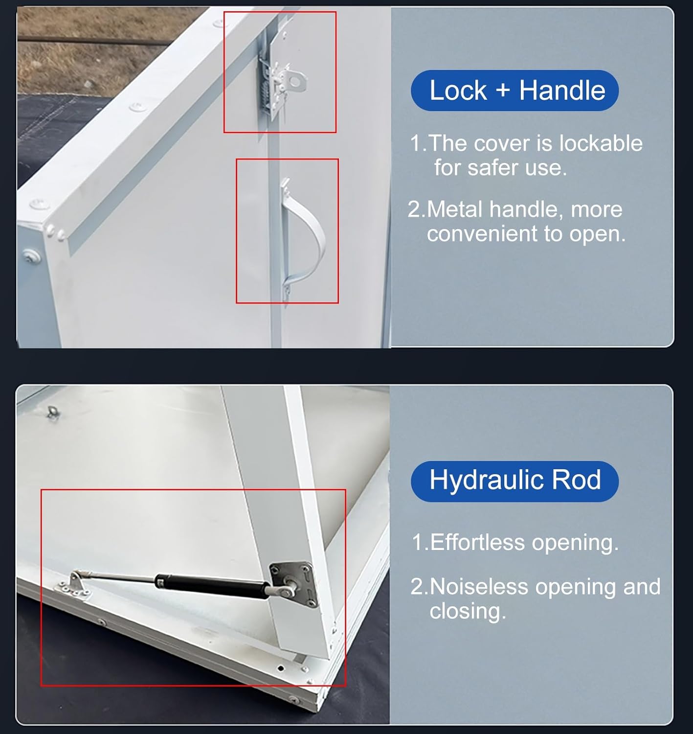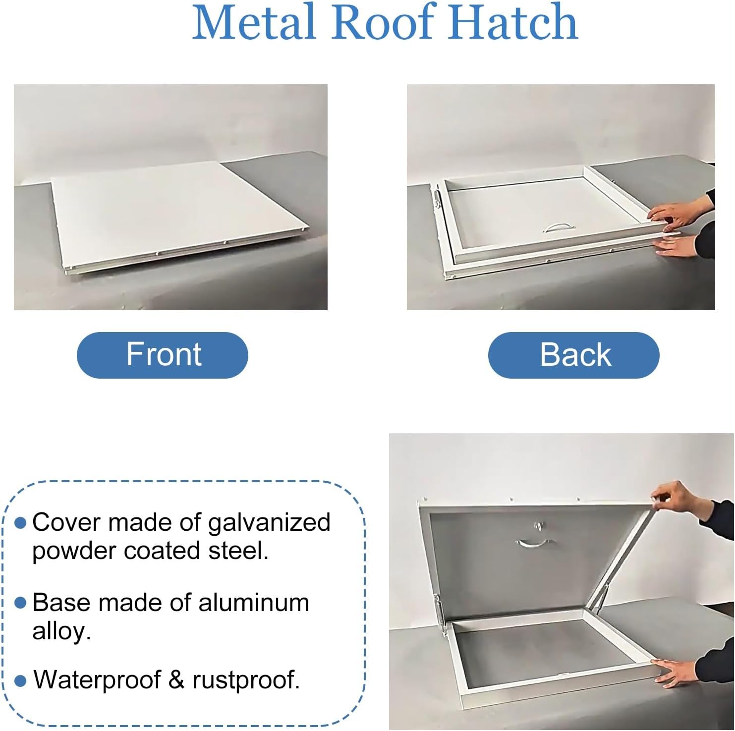 Is your skylight cover experiencing leaks? Traditional outdoor rain covers can become deformed or damaged over time. Upgrade to our durable roof hatch, designed to withstand harsh weather conditions and provide reliable protection against the elements. Specifications: - Material: Galvanized Steel Cover with Aluminum Alloy Base - Color: White - Size: Customizable Features: - Sturdy Metal Construction: Engineered for strength, this roof hatch is perfect for demanding environments, whether for home improvement projects or industrial applications. - Hitch Lock Design: Ensures secure closure, enhancing safety during use. - Hydraulic Support Bar: Allows for smooth opening and closing of the lid, minimizing the risk of hand pinching. - Insulation and Protection: Effectively insulates against heat, shields from wind and rain, and reduces noise for a more comfortable space. - Versatile Application: Ideal for homes, commercial buildings, schools, and more. Packing List: - 1 x Roof Hatch Important Notes: - Please measure the hole’s dimensions accurately before ordering and provide us with the measurements. - For improved sealing, consider using adhesive to fill any gaps. - Manual measurement may result in slight variations of 0 - 1 cm (0 - 3/8"). - Due to lighting and viewing angles, actual product colors may vary slightly. Customer Support: If you have any inquiries regarding our roof hatch, feel free to reach out. We are committed to providing you with the best possible solution.