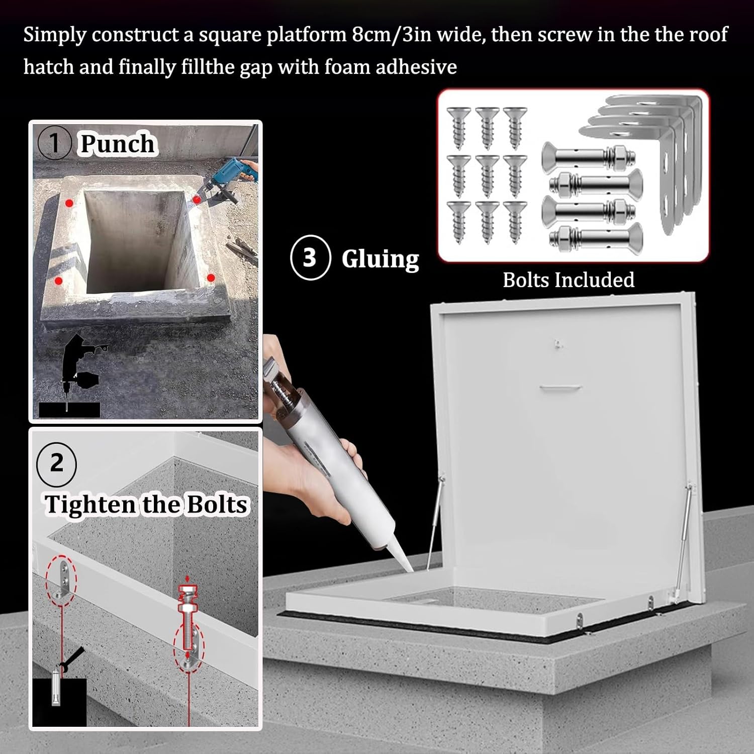 This galvanized steel access hatch provides convenient roof access, provide security and storm protection for multiple environments including attic exit or roof window, and moreSpecification:Material: Aluminum AlloySize: CustomizableBottom Frame Inner Diameter Size: 50cm, 55cm, 60 cm, 65 cm, 70 cm, 75 cm, 80 cm, 85 cm, 90 cm, 95 cm, 100 cmInner Size=Outside Size+12cm/4.7inFeatures:Pre drilled holes for easy installationSmooth Corners improve the safety of useSimply push the lid gently, and it will open slowlyPull handle design for easy opening and closingSupport to open the lid, the maximum angle is 90 degreesDoor Latch Design can secure the hatch and prevents break insSeal Strip can play a role in preventing wind, rain, Warmth and noise reductionPackage Contents:Roof Hatch x 1BoltsTips:Manual measurement products may have dimensions of a few centimeters of difference, please understand.There may be some differences between the image and the product due to display and lighting reasons, please refer to the actual product.