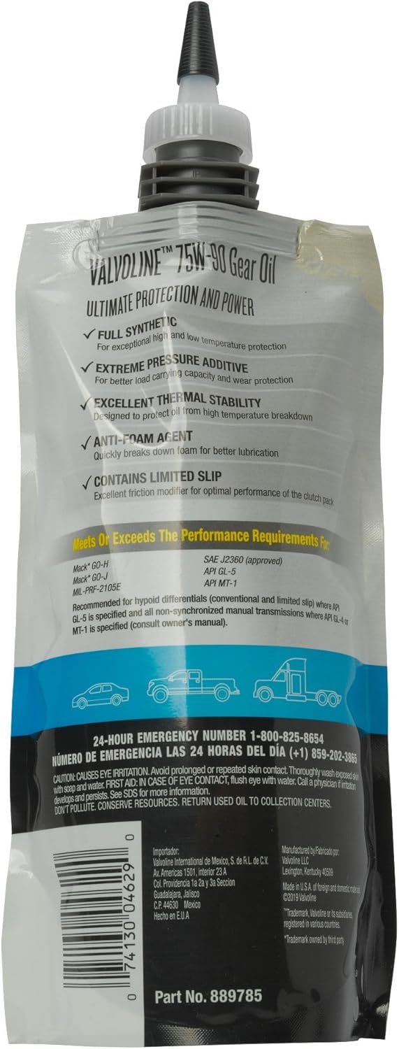 Valvoline Advanced Full Synthetic 75W-90 Gear Oil goes where other gear oils don’t. Our patented pouch is easy to use in compact spaces, releasing 2X more fluid with less effort for 3X faster filling vs. traditional bottle packaging using 75W-90 Gear Oil. Engineered for hypoid rear differentials and non-synchronized manual transmissions, the full synthetic formulation and special additives protect from rust and corrosion while providing enhanced high temperature performance and cold temperature fluidity. With 30% better protection against towing and heavy loads, 1.5X stronger extreme pressure protection and 1.5X better gear wear protection vs. Valvoline Daily Protection 75W-90 in ASTM D-7452, it’s essential for demanding, severe-service driving as well as off-roading. Our innovative gear lubricant features a limited slip friction modifier for optimal clutch pack performance, an extreme pressure additive to protect gear teeth and prolong life, and an anti-foaming agent for better lubrication. Protect your gears with Valvoline, the #1 gear oil brand.