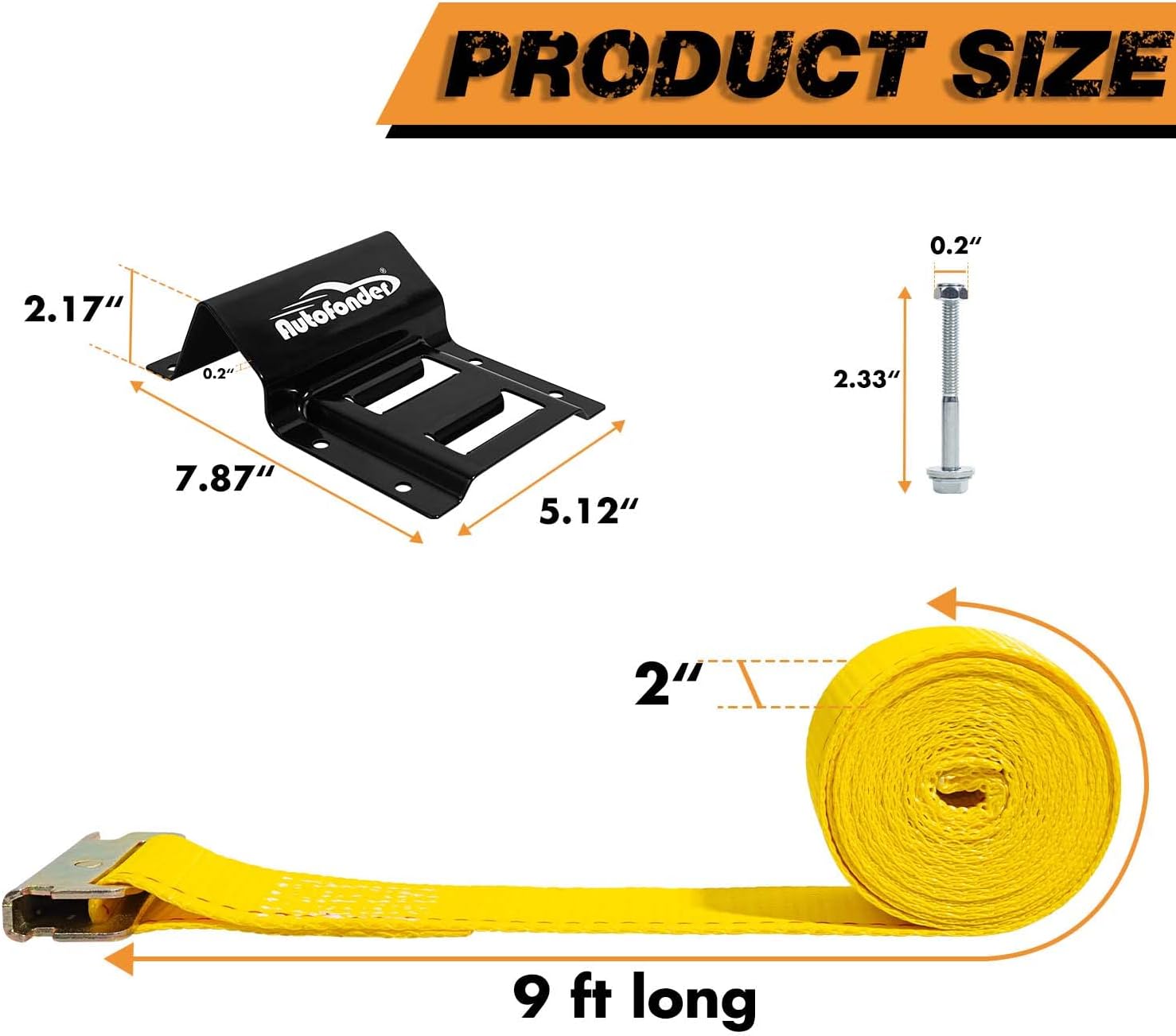 | Included Components | 4 Pack Classic Yellow E Track Ratchet Straps, 48 Pack 2-3/8" Hex Bolts+Hex Nuts+ Flat Washers, 8 Pack Black Wheel Chocks |