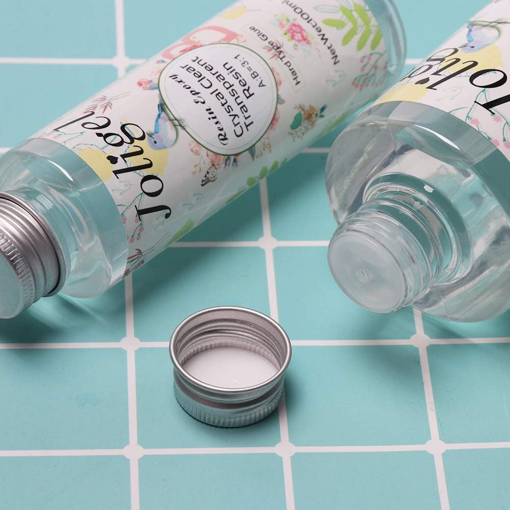 Joligel Two Component Epoxy Resin AB Glue Kit, Hard Type Crystal Clear Transparent for Casting and Coating Size: 300Ml of A glue + 100Ml of B glue Mix ratio (weight): 3 : 1 Mix ratio (volume): 2.5 : 1 Quality: Self degassing, odor free, crystal clear highly resistant to yellowing from UV exposure. Uses: Can be used as either a coating for tables, bars, wood, canvas paintings, etc. or cast in a suitable mold. Can be mixed with dyes, paints, pigments, glitter, etc. to give different finishes. The package includes: 1x Epoxy resin A 300ML 1x Epoxy resin B 100ML 3x Measuring cup 100ML 3x Wooden stir bars