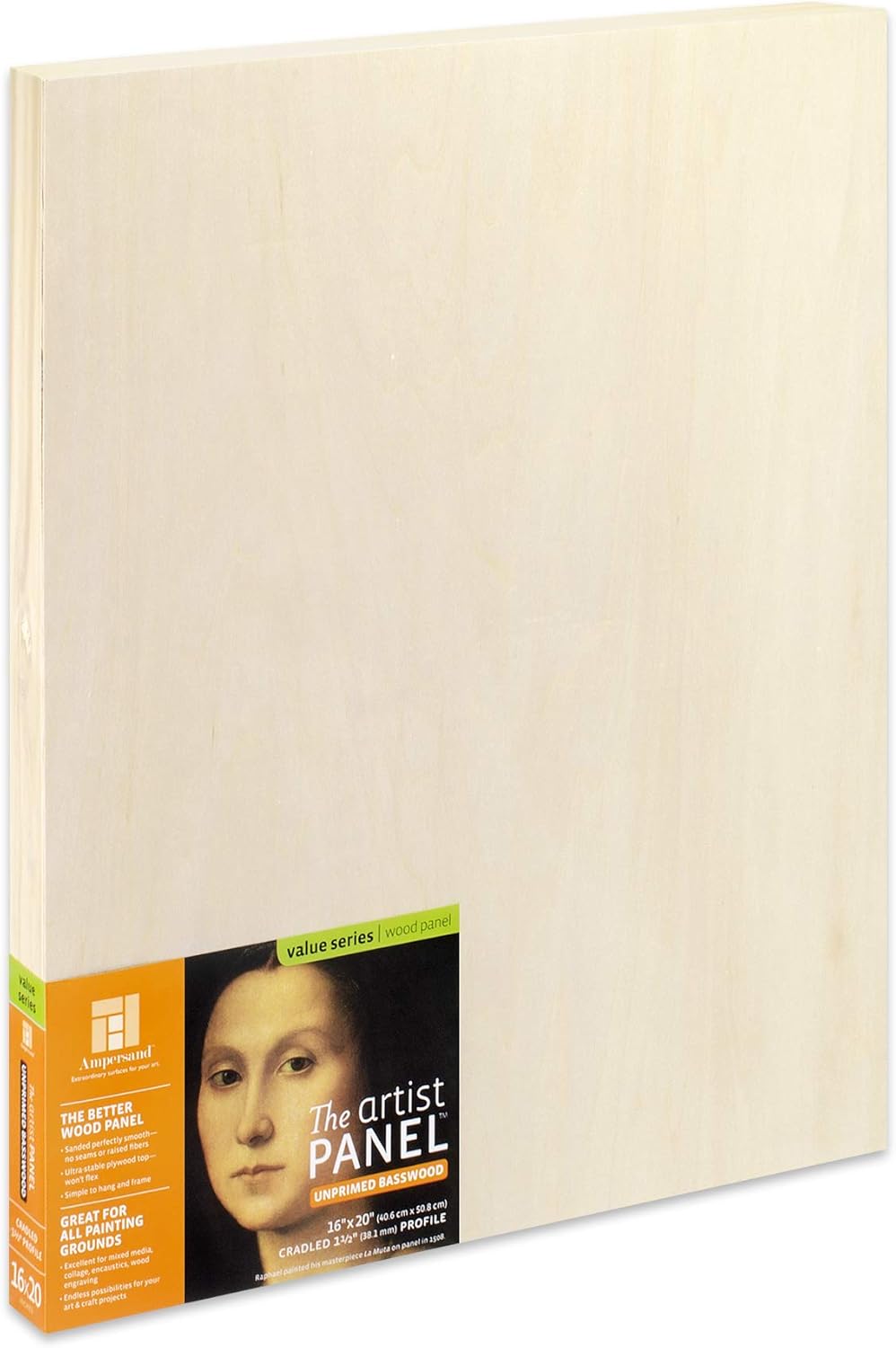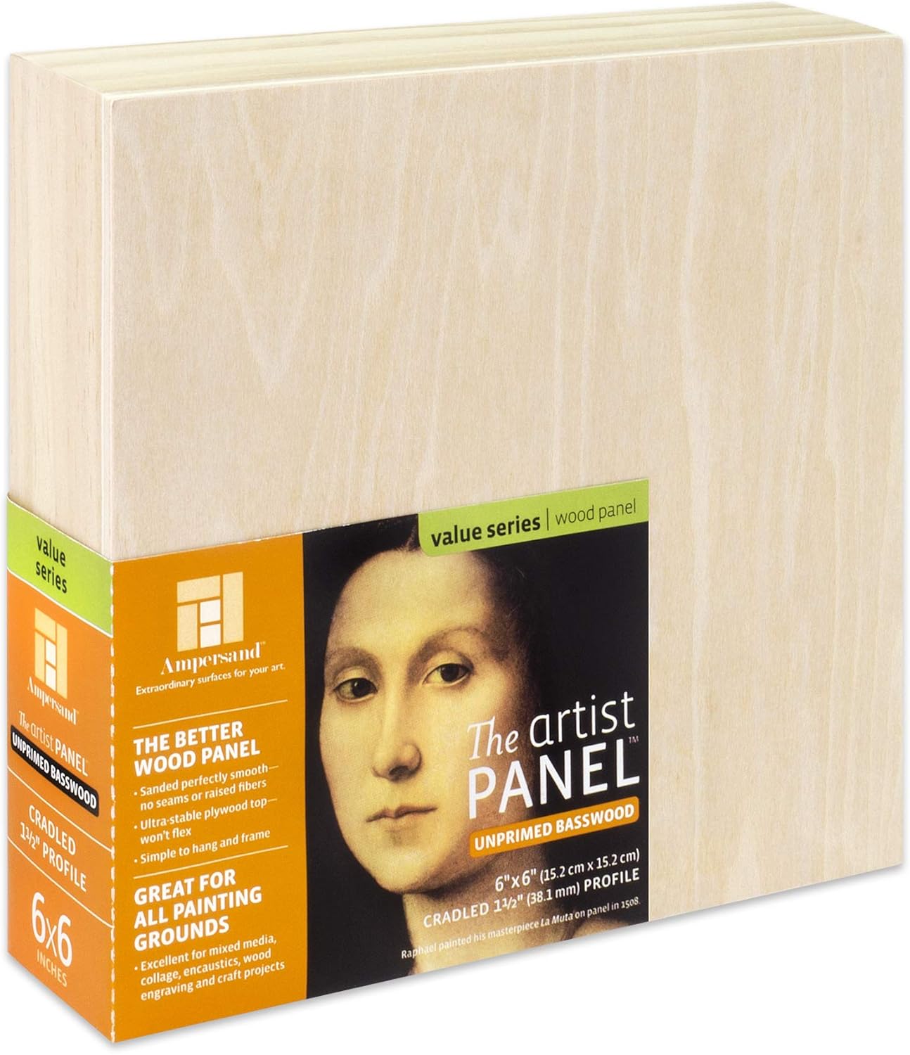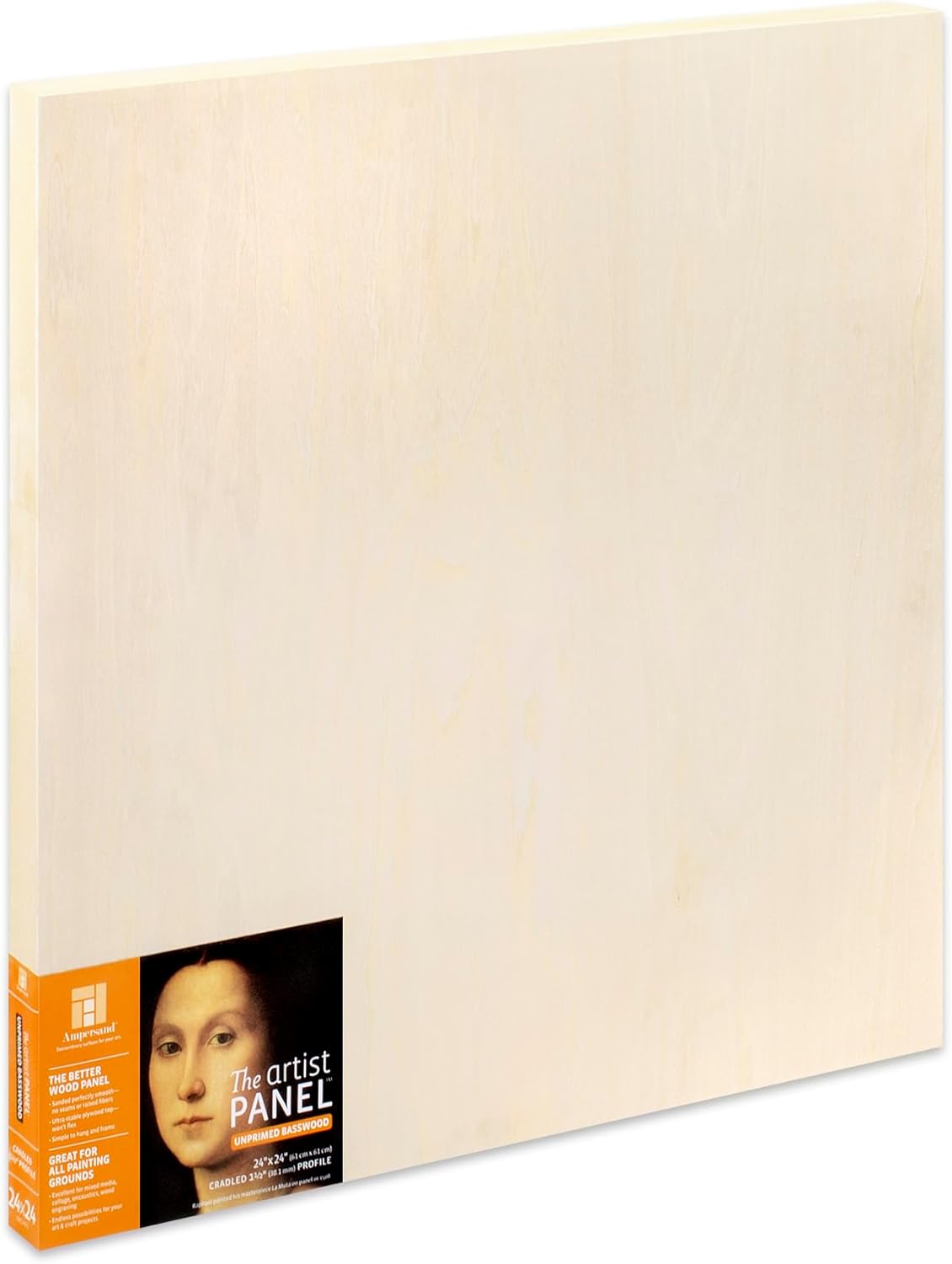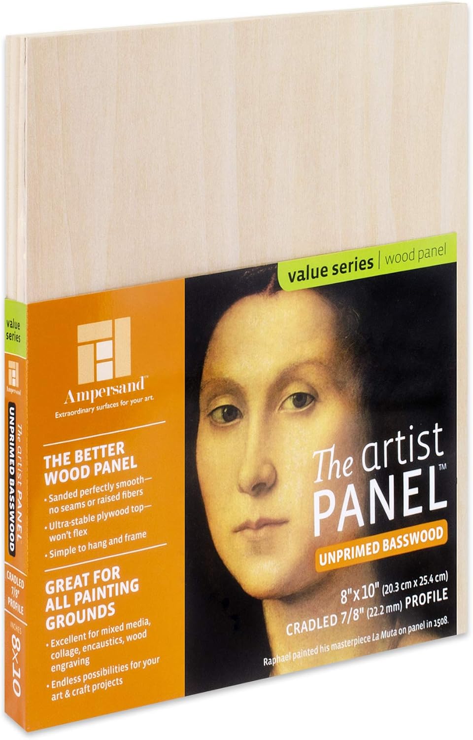 Are you frustrated with the quality of many wood panels? Compared with other raw surfaces on the market, Ampersand's Unprimed Basswood Artist Panel painting panel is free of plywood seams, knots or troublesome raised fibers providing the cleaner, more professional look that artists want. The Unprimed Basswood panel is handcrafted using a sturdy, non-flexible 4mm basswood top, sanded perfectly smooth and ready to seal and prime with the ground of your choice. Basswood is a premium, select wood that outperforms the typically used birch plywood in many ways. It is inherently smoother with a tight wood grain and no raised fibers, making it easier to gesso and paint on. Basswood is ultra-stable and will not give, bend or flex. The 7/8" profile Unprimed Basswood panel is simple to hang or frame. The support frames are made with quality solid wood strips that can be finished with paint or stain. The cradled back allows you to attach hanging hardware and display your artwork easily - without a frame! Unprimed Basswood is great for encaustic, mixed media, collage and wood engraving. The tight grain of the Ampersand Unprimed Basswood panels makes them the preferred choice for finely detailed wood burning / pyrography. All wood should be sealed and primed before painting. You can use clear gesso to see the wood grain through the sealer and primer.