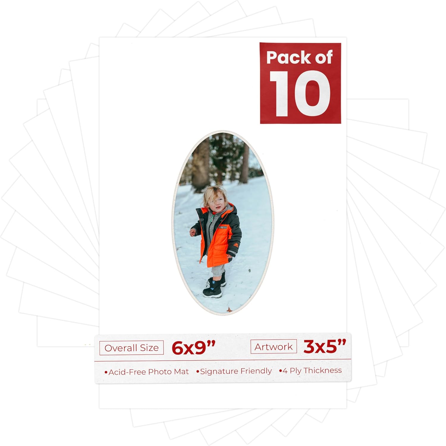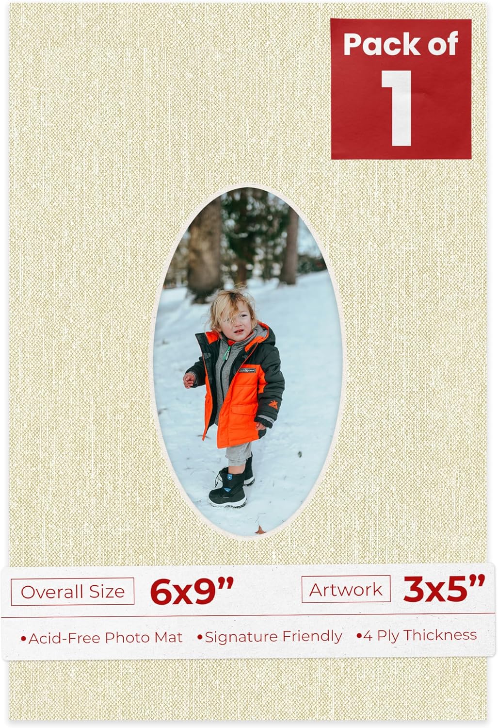 OVERALL SIZE (Made to fit a Frame Size Measuring) 6x9 Inches | Bevel Cut Oval Opening Size of 2.5x4.5 inches | For a Photo Measuring 3x5 Inches. THIS IS FOR 10 matboards. Fresh linen canvas PHOTO MAT with a oval bevel cut opening. A great way to change up the look of an existing frame with a new accent mat board. This matte also works great as a replacement for damaged, dirty, or faded matting in your old frames. PREMIUM QUALITY: Our precut photo matboards are acid free & precision cut with a 45 degree bevel by machine for perfect corners and NO over-cuts every single time! All of our precut matboards are MANUFACTURED BY POSTER PALOOZA IN THE USA.