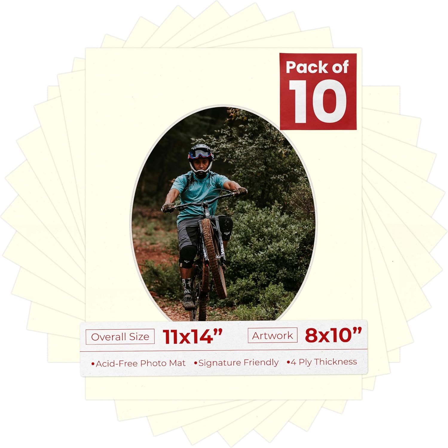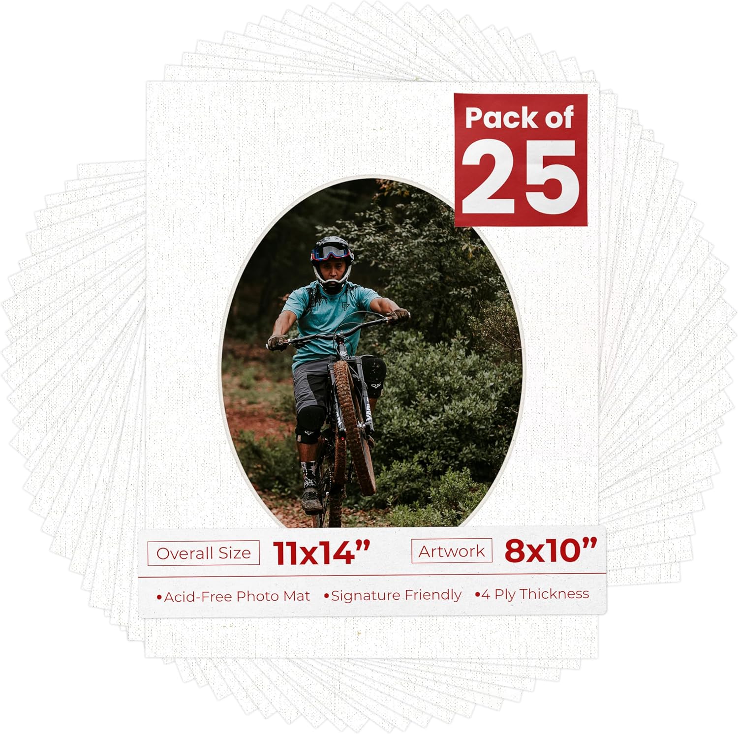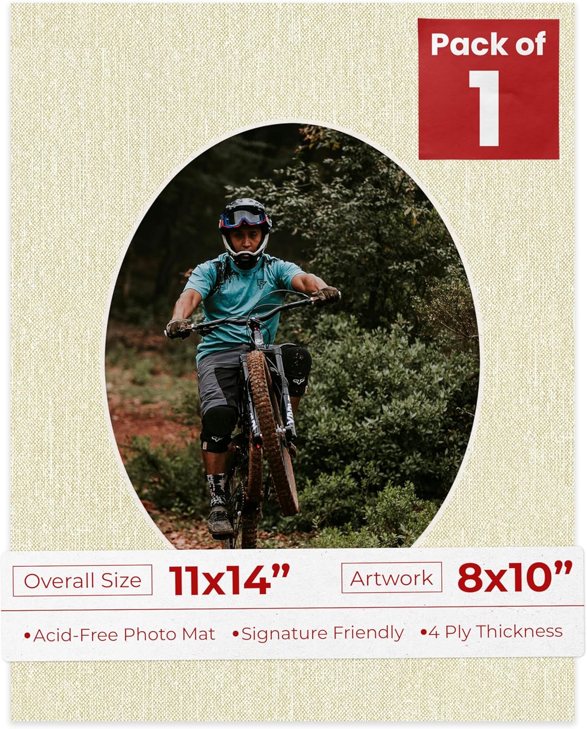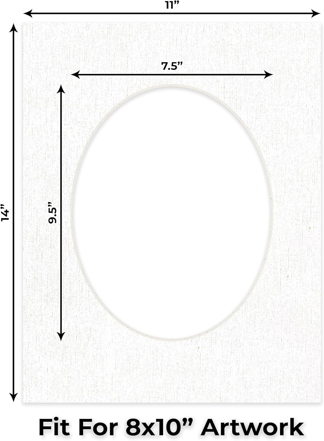 OVERALL SIZE (Made to fit a Frame Size Measuring) 11x14 Inches | Bevel Cut Oval Opening Size of 7.5x9.5 inches | For a Photo Measuring 8x10 Inches. THIS IS FOR 10 matboards. White linen canvas PHOTO MAT with a oval bevel cut opening. A great way to change up the look of an existing frame with a new accent mat board. This matte also works great as a replacement for damaged, dirty, or faded matting in your old frames. PREMIUM QUALITY: Our precut photo matboards are acid free & precision cut with a 45 degree bevel by machine for perfect corners and NO over-cuts every single time. All of our precut matboards are MANUFACTURED BY POSTER PALOOZA IN THE USA.