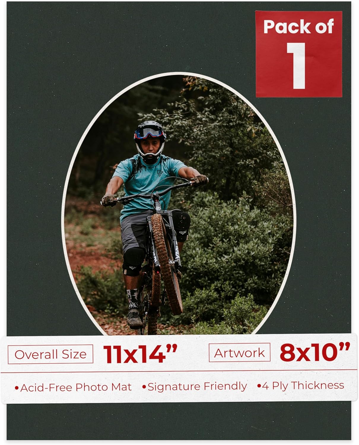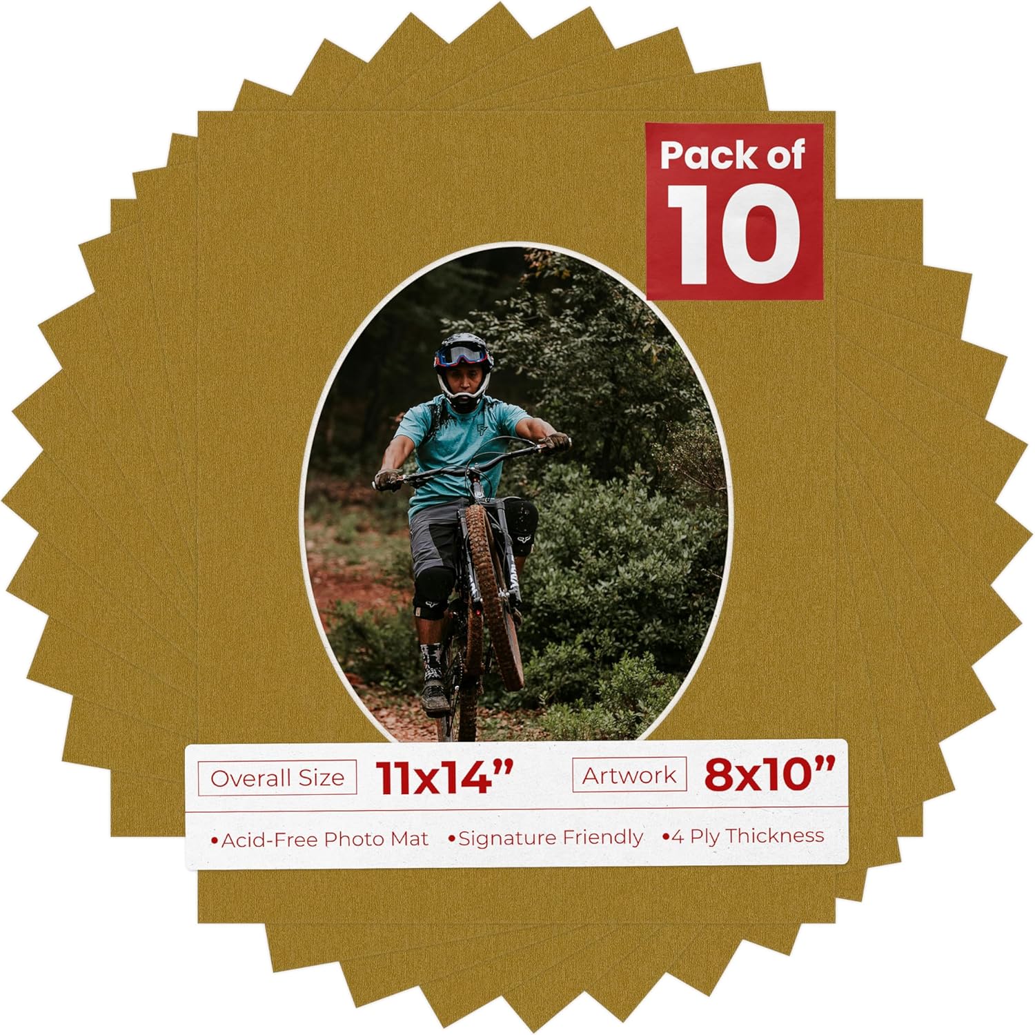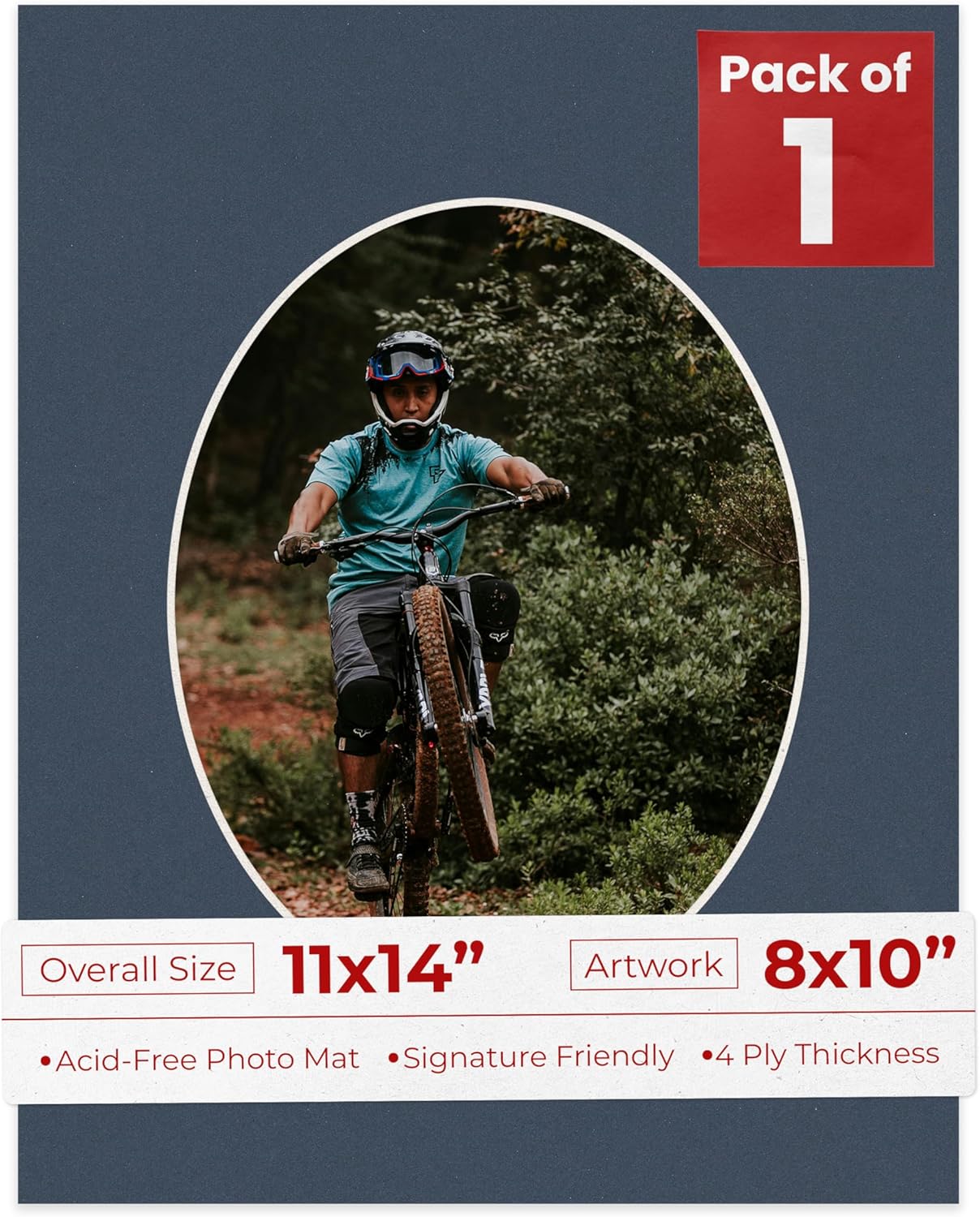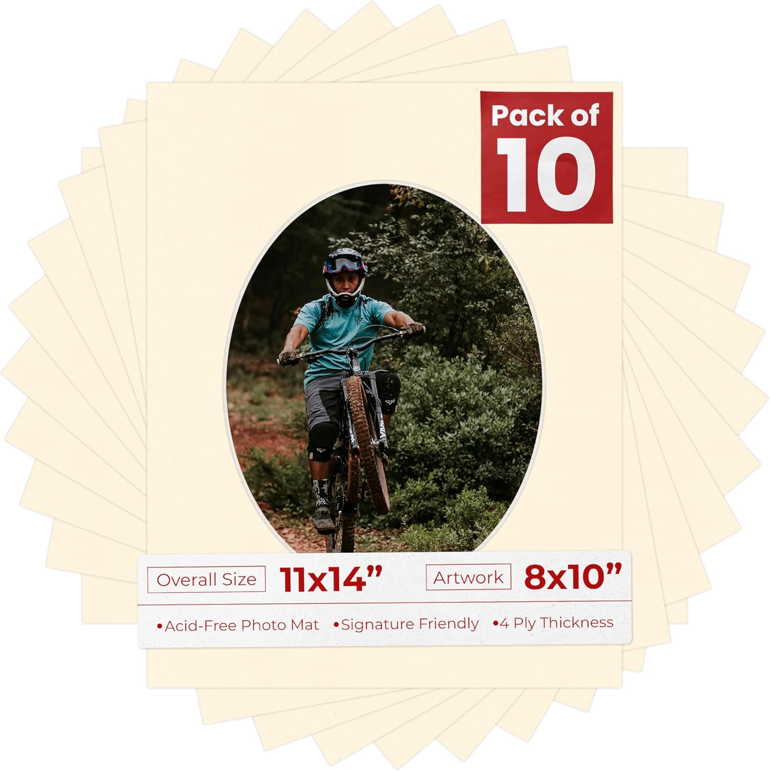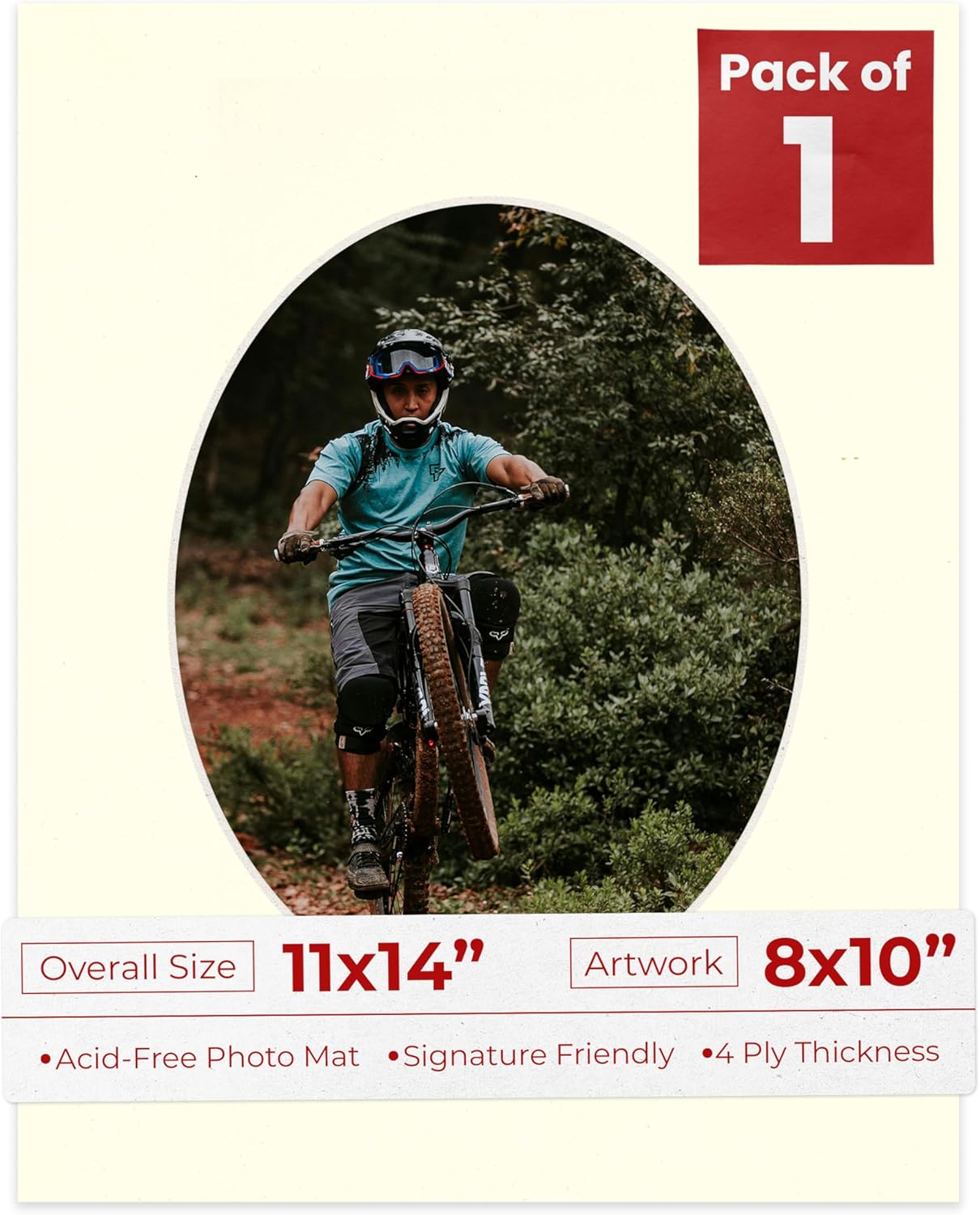 OVERALL SIZE (Made to fit a Frame Size Measuring) 11x14 Inches | Bevel Cut Oval Opening Size of 7.5x9.5 inches | For a Photo Measuring 8x10 Inches. THIS IS FOR 10 matboards. White linen canvas PHOTO MAT with a oval bevel cut opening. A great way to change up the look of an existing frame with a new accent mat board. This matte also works great as a replacement for damaged, dirty, or faded matting in your old frames. PREMIUM QUALITY: Our precut photo matboards are acid free & precision cut with a 45 degree bevel by machine for perfect corners and NO over-cuts every single time. All of our precut matboards are MANUFACTURED BY POSTER PALOOZA IN THE USA.