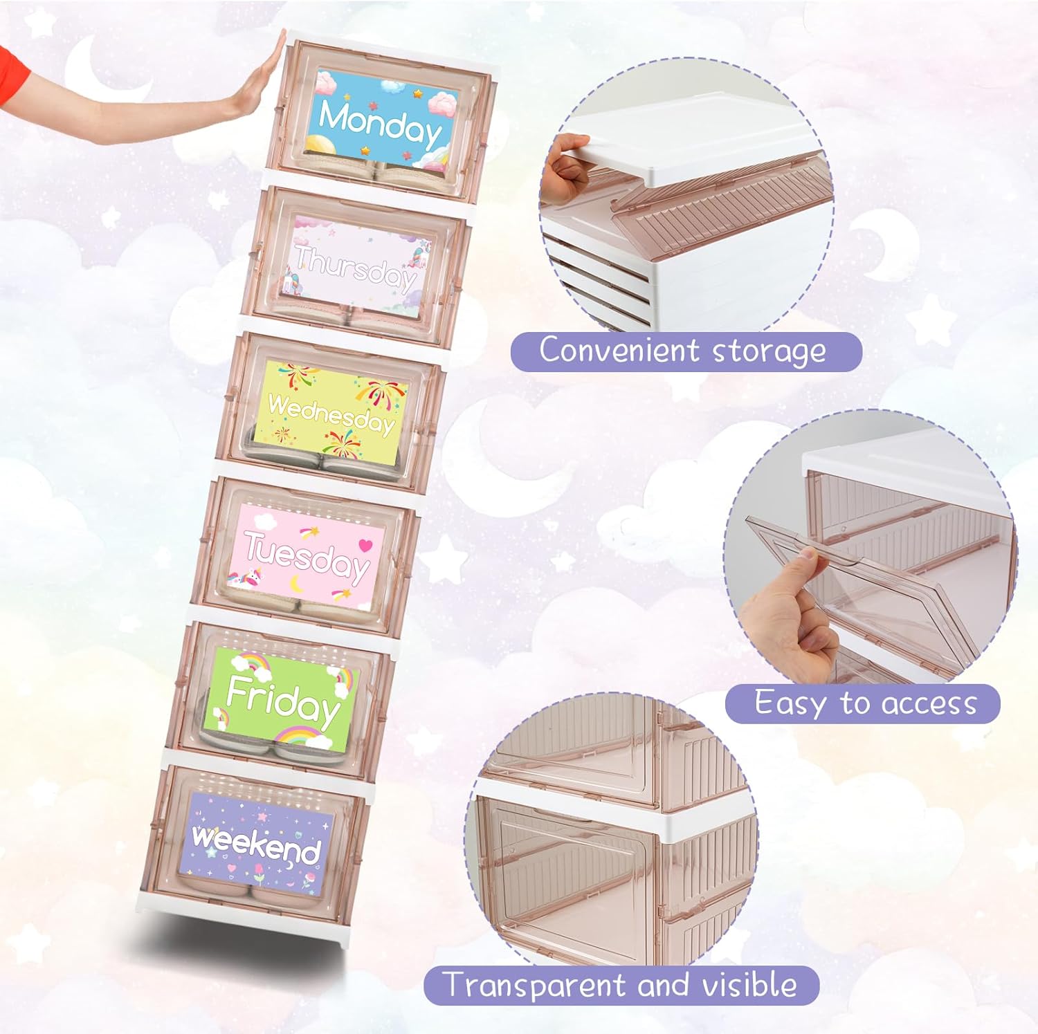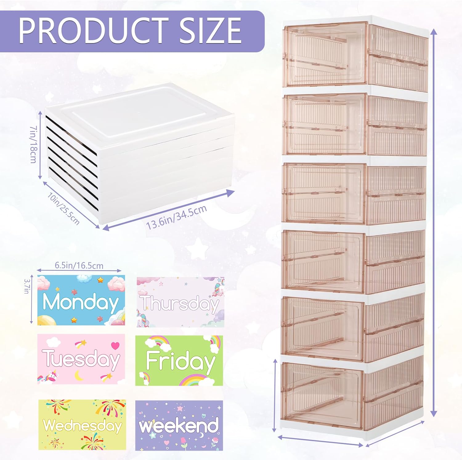 Features: This 6-shelf foldable organizer, made from durable, safe plastic, offers spacious, breathable storage for clothes and shoes with clear windows for easy access. Color-coded daily labels simplify weekly planning. Lightweight and tool-free assembly make it perfect for bedrooms, closets, nurseries, and small spaces, keeping daily essentials neatly organized and accessible. Specifications: Material: Plastic Color: Light Brown Size:41 × 14 × 10 inches Package includes: 1 × Daily Weekly Clothes Organizer for Kids Notes: For manual measurement, please allow slight errors in size. The color may have a slight difference due to different screen displays.