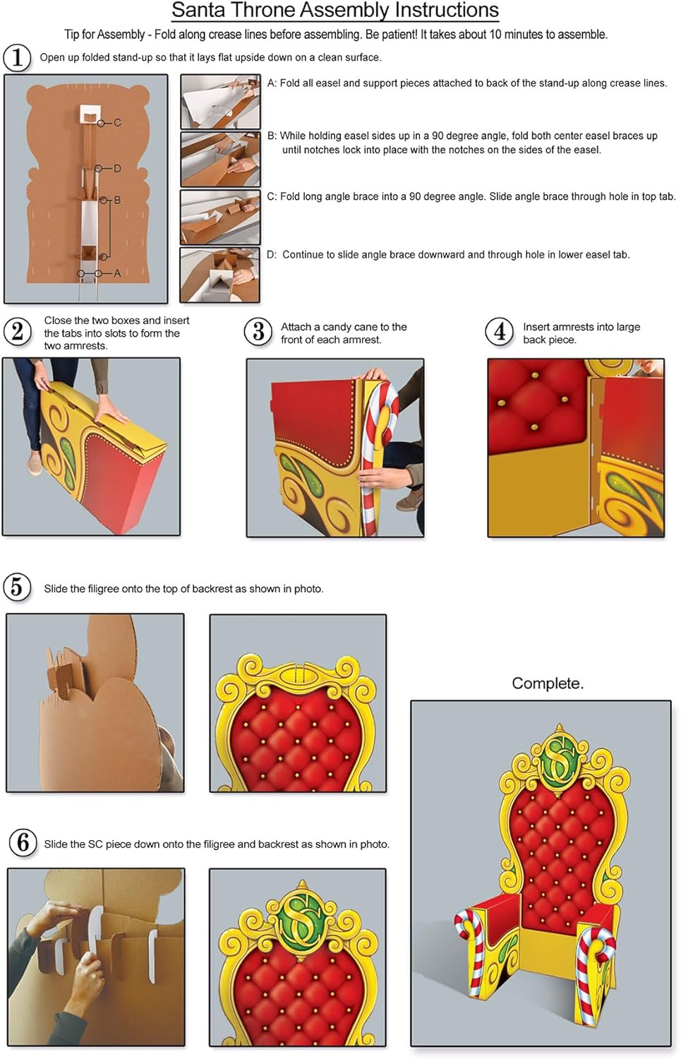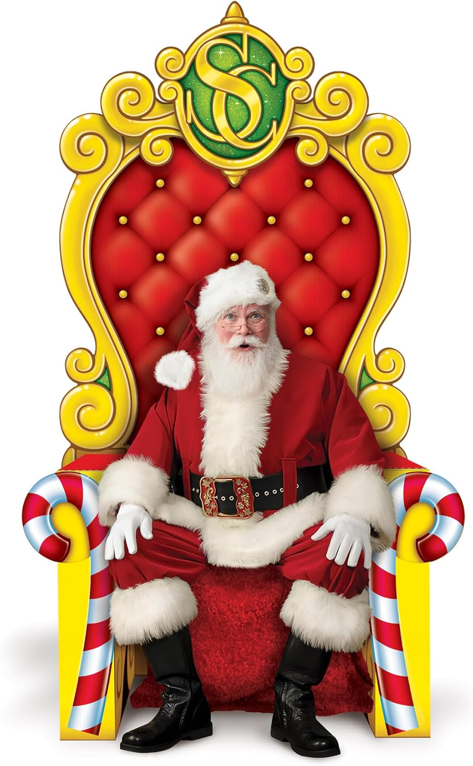 Beistle Santa’s Throne Chair Prop PROUDLY MADE IN THE USAThis enchanting Santa's 3-D Throne is a festive prop chair that adds a touch of magic to your holiday celebrations. This lightweight throne photography prop is made of durable corrguated cardboard and has an easel attached. Easy assembly is required. You will need to use your own chair in front of this prop for someone to sit down in. The festive photo prop features a vibrant red hue with gold detailing and charming candy cane accents, creating a whimsical and festive atmosphere. At the top of the throne, you'll find the iconic "SC" monogram, adding an extra dose of Santa Clause charm.This prop measures 7 feet 1.75 inches tall by 3 feet 9.25 inches wide. To enhance the interactive experience, the prop is designed to accommodate a chair on the inside, allowing individuals to sit comfortably and pose for memorable photos. Create lasting memories with this 3D Santa Throne, perfect for holiday parties, photo booths, festive gatherings, and a perfect prop for holiday Christmas cards. Have Santa visit the party and use this Chair as a focal point of the function by allowing children to sit on Santa’s lap as they share with Santa their Christmas list. Hopefully they are on the Nice List.