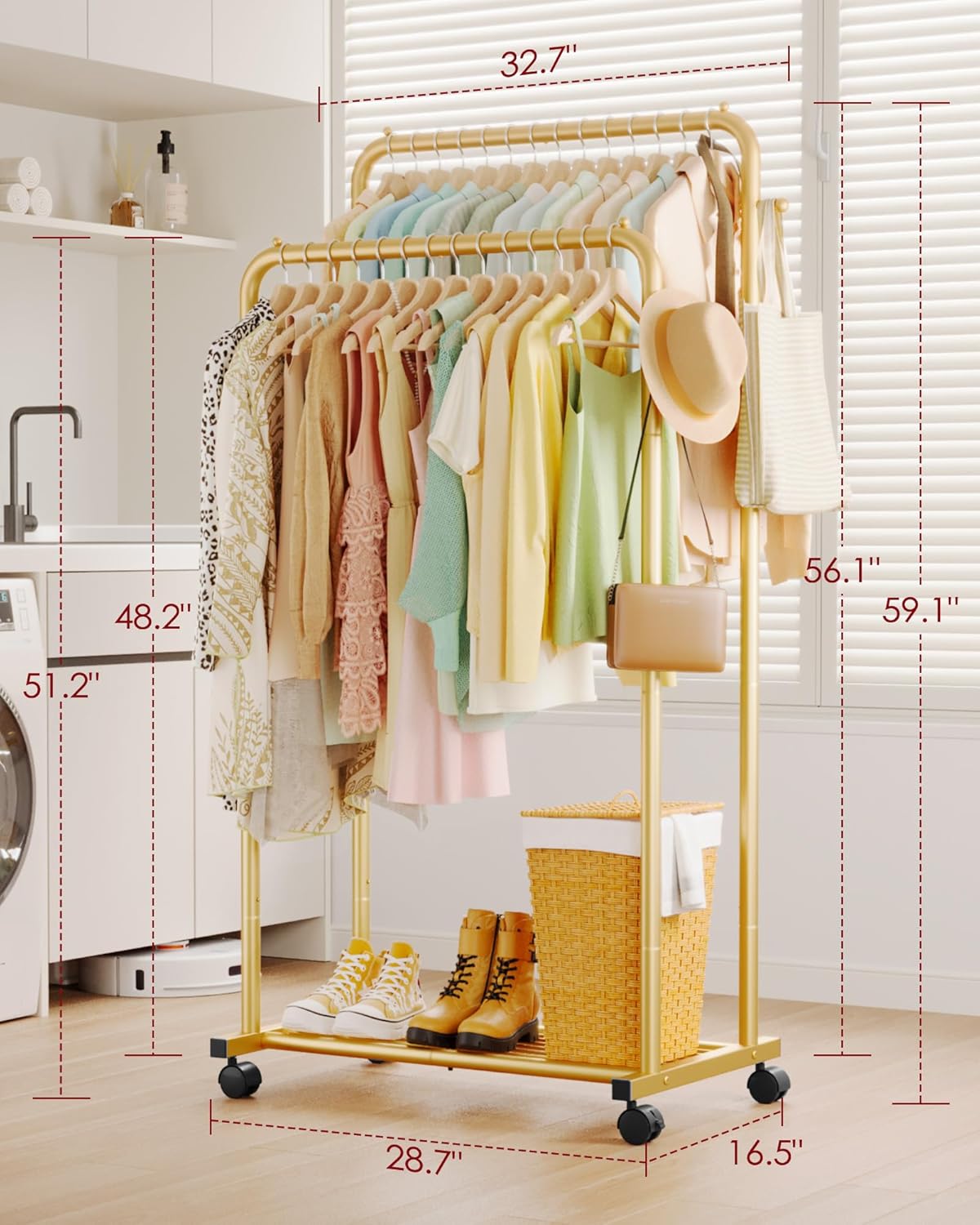 Looking for the ultimate kids clothing rack with wheels to simplify your life? 1. Built with premium metal, the Sakugi rolling clothes rack with shelves can support up to 170 pounds, making it perfect for heavy garments like coats and dresses. The strong construction of this hanging clothes rack ensures long-lasting stability, giving you peace of mind for both daily use and seasonal storage. 2. Designed with a spacious double-rod structure, this hanging rack holds up to 55 garments and includes 4 hooks and 2 side bars for accessories like bags, hats, and scarves. The upgraded mesh bottom shelf of the dress-up storage rack securely stores shoes, boxes, and folded clothes, keeping everything organized and accessible. 3. Equipped with smooth, silent universal wheels, this wardrobe closet rack glides effortlessly across any space, with two lockable wheels for secure placement. The perfectly spaced rods allow for easy access and excellent ventilation, making it ideal for air-drying clothes in the laundry room. This coat rack for freestanding use organizes your belongings in bedrooms, offices, or dorms.